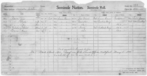 | Keywords: Enrollment for Seminole Census Card 412 - NARA - 267986.tif Scope and content Name Cowake Type Parent Sex Male City of Residence th Name Anna Davis Type By Blood Age 1 Sex Female Degree Indian Blood Full Roll Number 1371 City of Residence sb Name Jim Davis Type By Blood Age 25 Sex Male Degree Indian Blood Full Roll Number 1367 City of Residence sb Name Jim Davis Type Parent Sex Male City of Residence sb Name Lilly Davis Type By Blood Age 1 Sex Female Degree Indian Blood Full Roll Number 1369 City of Residence sb Name Rhoda Davis Type By Blood Age 23 Sex Female Degree Indian Blood Full Roll Number 1368 City of Residence sb Name Marty Type Parent Sex Male City of Residence nh Name Passake Type Parent Sex Female City of Residence sb Name Davis Yahola Type By Blood Age 8 Sex Male Degree Indian Blood Full Roll Number 1370 City of Residence sb General notes 267986 Local identifier 75-53A-SEMINOLE 412 Department of the Interior Office of Indian Affairs Office of the Commissioner to the Five Civilized Tribes 1893 - 1914 NARA's Southwest Region Fort Worth NRFA 1400 John Burgess Drive Fort Worth TX 76140 Record group Record Group 75 Records of the Bureau of Indian Affairs 1793 - 1999 Record group ARC 404 Enrollment Cards compiled 1898 - 1914 Series ARC 251747 File unit File unit ARC Variant control numbers NAIL Control Number NRFF-75-53A-28989<br /> NAIL Control Number NRFF-75-53A-29564<br /> NAIL Control Number NRFF-75-53A-29760<br /> NAIL Control Number NRFF-75-53A-29761<br /> NAIL Control Number NRFF-75-53A-29826<br /> NAIL Control Number NRFF-75-53A-29922<br /> NAIL Control Number NRFF-75-53A-40789<br /> NAIL Control Number NRFF-75-53A-43661<br /> NAIL Control Number NRFF-75-53A-52107<br /> NAIL Control Number NRFF-75-53A-SEMINOLE 412 yes Other versions <gallery> File Enrollment_for_Seminole_Census_Card_412_-_NARA_-_267986 tif tif File Enrollment_for_Seminole_Census_Card_412_-_NARA_-_267986 jpg jpg </gallery> NARA-cooperation PD-USGov Seminole census cards NARA TIF images with categorized JPGs |