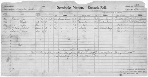 | Keywords: Enrollment for Seminole Census Card 412 - NARA - 267986.jpg Scope and content Name Cowake Type Parent Sex Male City of Residence th Name Anna Davis Type By Blood Age 1 Sex Female Degree Indian Blood Full Roll Number 1371 City of Residence sb Name Jim Davis Type By Blood Age 25 Sex Male Degree Indian Blood Full Roll Number 1367 City of Residence sb Name Jim Davis Type Parent Sex Male City of Residence sb Name Lilly Davis Type By Blood Age 1 Sex Female Degree Indian Blood Full Roll Number 1369 City of Residence sb Name Rhoda Davis Type By Blood Age 23 Sex Female Degree Indian Blood Full Roll Number 1368 City of Residence sb Name Marty Type Parent Sex Male City of Residence nh Name Passake Type Parent Sex Female City of Residence sb Name Davis Yahola Type By Blood Age 8 Sex Male Degree Indian Blood Full Roll Number 1370 City of Residence sb General notes 267986 Local identifier 75-53A-SEMINOLE 412 Department of the Interior Office of Indian Affairs Office of the Commissioner to the Five Civilized Tribes 1893 - 1914 NARA's Southwest Region Fort Worth NRFA 1400 John Burgess Drive Fort Worth TX 76140 Record group Record Group 75 Records of the Bureau of Indian Affairs 1793 - 1999 Record group ARC 404 Enrollment Cards compiled 1898 - 1914 Series ARC 251747 File unit File unit ARC Variant control numbers NAIL Control Number NRFF-75-53A-28989<br /> NAIL Control Number NRFF-75-53A-29564<br /> NAIL Control Number NRFF-75-53A-29760<br /> NAIL Control Number NRFF-75-53A-29761<br /> NAIL Control Number NRFF-75-53A-29826<br /> NAIL Control Number NRFF-75-53A-29922<br /> NAIL Control Number NRFF-75-53A-40789<br /> NAIL Control Number NRFF-75-53A-43661<br /> NAIL Control Number NRFF-75-53A-52107<br /> NAIL Control Number NRFF-75-53A-SEMINOLE 412 Other versions <gallery> File Enrollment_for_Seminole_Census_Card_412_-_NARA_-_267986 tif tif File Enrollment_for_Seminole_Census_Card_412_-_NARA_-_267986 jpg jpg </gallery> NARA-cooperation PD-USGov Seminole census cards |