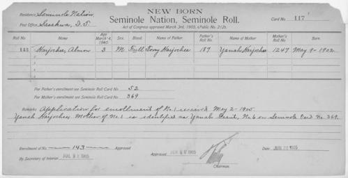 | Keywords: Enrollment for Seminole Census Card 117 - NARA - 267691.tif Scope and content Name Anna Wildcat Type By Blood Age 20 Sex Female Degree Indian Blood 3/4 Roll Number 402 City of Residence tp Name Cabbichuche Wildcat Type By Blood Age 60 Sex Male Degree Indian Blood Full Roll Number 399 City of Residence th Name Eliza Wildcat Type By Blood Age 16 Sex Female Degree Indian Blood 3/4 Roll Number 405 City of Residence tp Name Joney Wildcat Type By Blood Age 15 Sex Male Degree Indian Blood 3/4 Roll Number 401 City of Residence tp Name Kano Wildcat Type By Blood Age 7 Sex Male Degree Indian Blood 3/4 Roll Number 403 City of Residence tp Name Lucy Wildcat Type By Blood Age 45 Sex Female Degree Indian Blood 1/2 Roll Number 400 City of Residence tp Name Maney Wildcat Type By Blood Age 10 Sex Female Degree Indian Blood 3/4 Roll Number 404 City of Residence tp Name Almon Harjochee Type Newborn Age 3 Sex Male Degree Indian Blood FULL Roll Number 143 Post Office Sasakwa General notes 267691 Local identifier 75-53A-SEMINOLE 117 Department of the Interior Office of Indian Affairs Office of the Commissioner to the Five Civilized Tribes 1893 - 1914 NARA's Southwest Region Fort Worth NRFA 1400 John Burgess Drive Fort Worth TX 76140 Record group Record Group 75 Records of the Bureau of Indian Affairs 1793 - 1999 Record group ARC 404 Enrollment Cards compiled 1898 - 1914 Series ARC 251747 File unit File unit ARC Variant control numbers NAIL Control Number NRFF-75-53A-51257<br /> NAIL Control Number NRFF-75-53A-51260<br /> NAIL Control Number NRFF-75-53A-51261<br /> NAIL Control Number NRFF-75-53A-51269<br /> NAIL Control Number NRFF-75-53A-51270<br /> NAIL Control Number NRFF-75-53A-51274<br /> NAIL Control Number NRFF-75-53A-51275<br /> NAIL Control Number NRFF-75-53A-52692<br /> NAIL Control Number NRFF-75-53A-SEMINOLE 117 yes Other versions <gallery> File Enrollment_for_Seminole_Census_Card_117_-_NARA_-_267691 tif tif File Enrollment_for_Seminole_Census_Card_117_-_NARA_-_267691 jpg jpg </gallery> NARA-cooperation PD-USGov Cherokee census cards NARA TIF images with categorized JPGs |