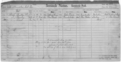 | Keywords: Enrollment for Seminole Census Card 419 - NARA - 267993.tif Scope and content Name Yaha Fixico Type Parent Sex Male City of Residence Creek Name Foushutche Type Parent Sex Male City of Residence tp Name Melake Type Parent Sex Female City of Residence nh Name Seeley Type Parent Sex Female City of Residence tp Name Hully Wolf Type By Blood Age 19 Sex Male Degree Indian Blood 1/2 Roll Number 1398 City of Residence nh Name Lena Wolf Type By Blood Age 1 Sex Female Degree Indian Blood 3/4 Roll Number 1400 City of Residence tp Name Nancy Wolf Type By Blood Age 18 Sex Female Degree Indian Blood Full Roll Number 1399 City of Residence tp General notes 267993 Local identifier 75-53A-SEMINOLE 419 Department of the Interior Office of Indian Affairs Office of the Commissioner to the Five Civilized Tribes 1893 - 1914 NARA's Southwest Region Fort Worth NRFA 1400 John Burgess Drive Fort Worth TX 76140 Record group Record Group 75 Records of the Bureau of Indian Affairs 1793 - 1999 Record group ARC 404 Enrollment Cards compiled 1898 - 1914 Series ARC 251747 File unit File unit ARC Variant control numbers NAIL Control Number NRFF-75-53A-32140<br /> NAIL Control Number NRFF-75-53A-32406<br /> NAIL Control Number NRFF-75-53A-41760<br /> NAIL Control Number NRFF-75-53A-46432<br /> NAIL Control Number NRFF-75-53A-51837<br /> NAIL Control Number NRFF-75-53A-51862<br /> NAIL Control Number NRFF-75-53A-51880<br /> NAIL Control Number NRFF-75-53A-SEMINOLE 419 yes Other versions <gallery> File Enrollment_for_Seminole_Census_Card_419_-_NARA_-_267993 tif tif File Enrollment_for_Seminole_Census_Card_419_-_NARA_-_267993 jpg jpg </gallery> NARA-cooperation PD-USGov Seminole census cards NARA TIF images with categorized JPGs |