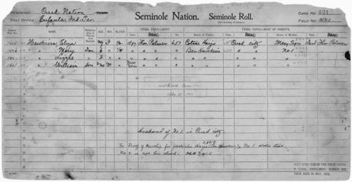 | Keywords: Enrollment for Seminole Census Card 421 - NARA - 267995.tif Scope and content Name Cotsar Harjo Type Parent Sex Male City of Residence Creek Name Ben Hawkins Type Parent Sex Male City of Residence Creek Name Eliza Hawkins Type By Blood Age 27 Sex Female Degree Indian Blood 1/2 Roll Number 1405 City of Residence tp Name Lizzie Hawkins Type By Blood Age 2 Sex Female Degree Indian Blood 1/4 Roll Number 1407 City of Residence tp Name Mary Hawkins Type By Blood Age 6 Sex Female Degree Indian Blood 1/4 Roll Number 1406 City of Residence tp Name William Hawkins Type By Blood Age 1 Sex Male Degree Indian Blood 1/4 Roll Number 1408 City of Residence tp Name Mary Tiger Type Parent Sex Female City of Residence tp General notes 267995 Local identifier 75-53A-SEMINOLE 421 Department of the Interior Office of Indian Affairs Office of the Commissioner to the Five Civilized Tribes 1893 - 1914 NARA's Southwest Region Fort Worth NRFA 1400 John Burgess Drive Fort Worth TX 76140 Record group Record Group 75 Records of the Bureau of Indian Affairs 1793 - 1999 Record group ARC 404 Enrollment Cards compiled 1898 - 1914 Series ARC 251747 File unit File unit ARC Variant control numbers NAIL Control Number NRFF-75-53A-34255<br /> NAIL Control Number NRFF-75-53A-35757<br /> NAIL Control Number NRFF-75-53A-35780<br /> NAIL Control Number NRFF-75-53A-35808<br /> NAIL Control Number NRFF-75-53A-35818<br /> NAIL Control Number NRFF-75-53A-35867<br /> NAIL Control Number NRFF-75-53A-49681<br /> NAIL Control Number NRFF-75-53A-SEMINOLE 421 yes Other versions <gallery> File Enrollment_for_Seminole_Census_Card_421_-_NARA_-_267995 tif tif File Enrollment_for_Seminole_Census_Card_421_-_NARA_-_267995 jpg jpg </gallery> NARA-cooperation PD-USGov Seminole census cards NARA TIF images with categorized JPGs |