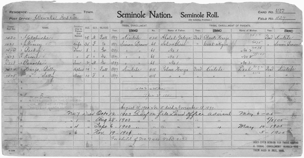 | Keywords: Enrollment for Seminole Census Card 427 - NARA - 268001.jpg Scope and content Name Becky Type By Blood Age 8 Sex Female Degree Indian Blood 3/4 Roll Number 1422 City of Residence sb Name Billy Harjo Type By Blood Age 19 Sex Male Degree Indian Blood Full Roll Number 1424 City of Residence k Name Pahose Harjo Type Parent Sex Male City of Residence k Name Sally Harjo Type By Blood Age 10 Sex Female Degree Indian Blood Full Roll Number 1425 City of Residence k Name Kissie Type By Blood Age 5 Sex Female Degree Indian Blood 3/4 Roll Number 1423 City of Residence sb Name Leah Type Parent Sex Female City of Residence k Name Mimey Type By Blood Age 35 Sex Female Degree Indian Blood 1/2 Roll Number 1421 City of Residence sb Name Panoche Type By Blood Age 2 Sex Male Degree Indian Blood 3/4 City of Residence sb Name Soknothese Type Parent Sex Male City of Residence Creek Name Ahalak Yadega Type Parent Sex Male City of Residence oh Name Yakopuche Type By Blood Age 28 Sex Male Degree Indian Blood Full Roll Number 1420 City of Residence k General notes 268001 Local identifier 75-53A-SEMINOLE 427 Department of the Interior Office of Indian Affairs Office of the Commissioner to the Five Civilized Tribes 1893 - 1914 NARA's Southwest Region Fort Worth NRFA 1400 John Burgess Drive Fort Worth TX 76140 Record group Record Group 75 Records of the Bureau of Indian Affairs 1793 - 1999 Record group ARC 404 Enrollment Cards compiled 1898 - 1914 Series ARC 251747 File unit File unit ARC Variant control numbers NAIL Control Number NRFF-75-53A-24475<br /> NAIL Control Number NRFF-75-53A-34127<br /> NAIL Control Number NRFF-75-53A-34938<br /> NAIL Control Number NRFF-75-53A-35021<br /> NAIL Control Number NRFF-75-53A-38789<br /> NAIL Control Number NRFF-75-53A-39207<br /> NAIL Control Number NRFF-75-53A-42192<br /> NAIL Control Number NRFF-75-53A-43544<br /> NAIL Control Number NRFF-75-53A-47580<br /> NAIL Control Number NRFF-75-53A-52020<br /> NAIL Control Number NRFF-75-53A-52353<br /> NAIL Control Number NRFF-75-53A-SEMINOLE 427 Other versions <gallery> File Enrollment_for_Seminole_Census_Card_427_-_NARA_-_268001 tif tif File Enrollment_for_Seminole_Census_Card_427_-_NARA_-_268001 jpg jpg </gallery> NARA-cooperation PD-USGov Seminole census cards |