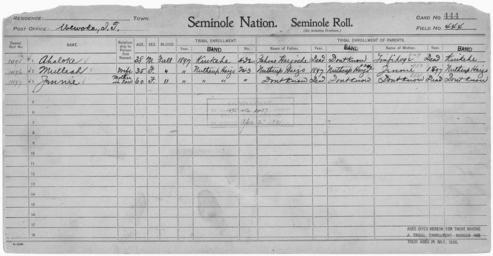 | Keywords: Enrollment for Seminole Census Card 444 - NARA - 268018.tif Scope and content Name Ahaloke Type By Blood Age 38 Sex Male Degree Indian Blood Full Roll Number 1495 City of Residence k Name Nuthcup Harjo Type Parent Sex Male City of Residence nh Name Pahose Harjoche Type Parent Sex Male Name Jennie Type Parent Sex Female City of Residence nh Name Jennie Type By Blood Age 60 Sex Female Degree Indian Blood Full Roll Number 1497 City of Residence nh Name Linfikoge Type Parent Sex Female City of Residence k Name Mulleah Type By Blood Age 35 Sex Female Degree Indian Blood Full Roll Number 1496 City of Residence nh General notes 268018 Local identifier 75-53A-SEMINOLE 444 Department of the Interior Office of Indian Affairs Office of the Commissioner to the Five Civilized Tribes 1893 - 1914 NARA's Southwest Region Fort Worth NRFA 1400 John Burgess Drive Fort Worth TX 76140 Record group Record Group 75 Records of the Bureau of Indian Affairs 1793 - 1999 Record group ARC 404 Enrollment Cards compiled 1898 - 1914 Series ARC 251747 File unit File unit ARC Variant control numbers NAIL Control Number NRFF-75-53A-22804<br /> NAIL Control Number NRFF-75-53A-34872<br /> NAIL Control Number NRFF-75-53A-35395<br /> NAIL Control Number NRFF-75-53A-37556<br /> NAIL Control Number NRFF-75-53A-37557<br /> NAIL Control Number NRFF-75-53A-39560<br /> NAIL Control Number NRFF-75-53A-42758<br /> NAIL Control Number NRFF-75-53A-SEMINOLE 444 yes Other versions <gallery> File Enrollment_for_Seminole_Census_Card_444_-_NARA_-_268018 tif tif File Enrollment_for_Seminole_Census_Card_444_-_NARA_-_268018 jpg jpg </gallery> NARA-cooperation PD-USGov Seminole census cards NARA TIF images with categorized JPGs |