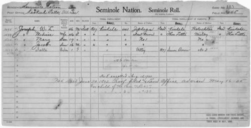 | Keywords: Enrollment for Seminole Census Card 445 - NARA - 268019.jpg Scope and content Name Holochetse Type Parent Sex Female City of Residence k Name Jophega Type Parent Sex Male City of Residence k Name Jacob Joseph Type By Blood Age 16 Sex Male Degree Indian Blood Full Roll Number 1501 City of Residence k Name Mary Joseph Type By Blood Age 17 Sex Female Degree Indian Blood Full Roll Number 1500 City of Residence k Name Medisse Joseph Type By Blood Age 46 Sex Female Degree Indian Blood Full Roll Number 1499 City of Residence k Name Salta Joseph Type By Blood Age 1 Sex Female Degree Indian Blood Full Roll Number 1502 City of Residence k Name W L Joseph Type By Blood Sex Male Degree Indian Blood Full Roll Number 1498 City of Residence k Name Miley Type Parent Sex Female City of Residence tl Name Uttey Type Parent Sex Male City of Residence sb General notes 268019 Local identifier 75-53A-SEMINOLE 445 Department of the Interior Office of Indian Affairs Office of the Commissioner to the Five Civilized Tribes 1893 - 1914 NARA's Southwest Region Fort Worth NRFA 1400 John Burgess Drive Fort Worth TX 76140 Record group Record Group 75 Records of the Bureau of Indian Affairs 1793 - 1999 Record group ARC 404 Enrollment Cards compiled 1898 - 1914 Series ARC 251747 File unit File unit ARC Variant control numbers NAIL Control Number NRFF-75-53A-36595<br /> NAIL Control Number NRFF-75-53A-38157<br /> NAIL Control Number NRFF-75-53A-38168<br /> NAIL Control Number NRFF-75-53A-38173<br /> NAIL Control Number NRFF-75-53A-38174<br /> NAIL Control Number NRFF-75-53A-38175<br /> NAIL Control Number NRFF-75-53A-38178<br /> NAIL Control Number NRFF-75-53A-42023<br /> NAIL Control Number NRFF-75-53A-50274<br /> NAIL Control Number NRFF-75-53A-SEMINOLE 445 Other versions <gallery> File Enrollment_for_Seminole_Census_Card_445_-_NARA_-_268019 tif tif File Enrollment_for_Seminole_Census_Card_445_-_NARA_-_268019 jpg jpg </gallery> NARA-cooperation PD-USGov Seminole census cards |