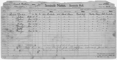 | Keywords: Enrollment for Seminole Census Card 456 - NARA - 268030.tif Scope and content Name Aleck Bemo Type Parent Sex Male City of Residence Creek Name Charlie Bemo Type By Blood Age 21 Sex Male Degree Indian Blood 1/2 Roll Number 1535 City of Residence k Name George Bemo Type By Blood Age 2 Sex Male Degree Indian Blood 1/2 Roll Number 1542 City of Residence k Name John Bemo Type By Blood Age 16 Sex Male Degree Indian Blood Full Roll Number 1537 City of Residence k Name Julia Bemo Type By Blood Age 18 Sex Female Degree Indian Blood 1/2 Roll Number 1536 City of Residence k Name Mary Bemo Type By Blood Age 8 Sex Female Degree Indian Blood 1/2 Roll Number 1540 City of Residence k Name Milly Bemo Type By Blood Age 4 Sex Female Degree Indian Blood 1/2 Roll Number 1541 City of Residence k Name Molly Bemo Type Parent Sex Female City of Residence k Name Nora Bemo Type By Blood Age 14 Sex Female Degree Indian Blood 1/2 Roll Number 1538 City of Residence k Name Willy Bemo Type By Blood Age 12 Sex Male Degree Indian Blood 1/2 Roll Number 1539 City of Residence k General notes 268030 Local identifier 75-53A-SEMINOLE 456 Department of the Interior Office of Indian Affairs Office of the Commissioner to the Five Civilized Tribes 1893 - 1914 NARA's Southwest Region Fort Worth NRFA 1400 John Burgess Drive Fort Worth TX 76140 Record group Record Group 75 Records of the Bureau of Indian Affairs 1793 - 1999 Record group ARC 404 Enrollment Cards compiled 1898 - 1914 Series ARC 251747 File unit File unit ARC Variant control numbers NAIL Control Number NRFF-75-53A-24554<br /> NAIL Control Number NRFF-75-53A-24556<br /> NAIL Control Number NRFF-75-53A-24558<br /> NAIL Control Number NRFF-75-53A-24560<br /> NAIL Control Number NRFF-75-53A-24561<br /> NAIL Control Number NRFF-75-53A-24564<br /> NAIL Control Number NRFF-75-53A-24565<br /> NAIL Control Number NRFF-75-53A-24566<br /> NAIL Control Number NRFF-75-53A-24568<br /> NAIL Control Number NRFF-75-53A-24569<br /> NAIL Control Number NRFF-75-53A-SEMINOLE 456 yes Other versions <gallery> File Enrollment_for_Seminole_Census_Card_456_-_NARA_-_268030 tif tif File Enrollment_for_Seminole_Census_Card_456_-_NARA_-_268030 jpg jpg </gallery> NARA-cooperation PD-USGov Seminole census cards NARA TIF images with categorized JPGs |