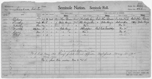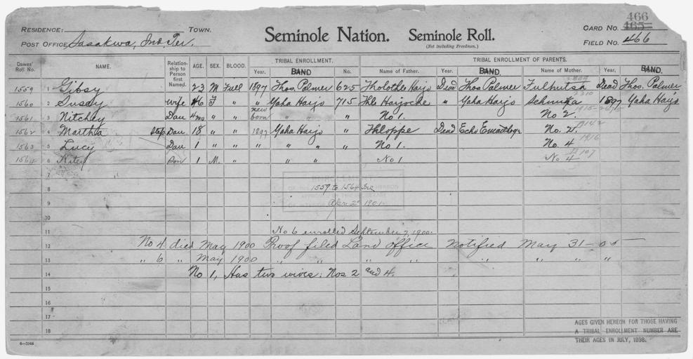 | Keywords: Enrollment for Seminole Census Card 466 - NARA - 268040.jpg Scope and content Name Fulhutsa Type Parent Sex Female City of Residence tp Name Gibsy Type By Blood Age 23 Sex Male Degree Indian Blood Full Roll Number 1559 City of Residence tp Name Tholothle Harjo Type Parent Sex Male City of Residence tp Name Thle Harjoche Type Parent Sex Male City of Residence yh Name Lucy Type By Blood Age 1 Sex Female Degree Indian Blood Full Roll Number 1563 City of Residence yh Name Martha Type By Blood Age 18 Sex Female Degree Indian Blood Full Roll Number 1562 City of Residence yh Name Nitchey Type By Blood Age 1 Sex Female Degree Indian Blood Full Roll Number 1561 City of Residence yh Name Nitey Type By Blood Age 1 Sex Male Degree Indian Blood Full Roll Number 1564 City of Residence yh Name Sehumka Type Parent Sex Female City of Residence yh Name Susey Type By Blood Age 46 Sex Female Degree Indian Blood Full Roll Number 1561 City of Residence yh Name Thloppe Type Parent Sex Male City of Residence ee General notes 268040 Local identifier 75-53A-SEMINOLE 466 Department of the Interior Office of Indian Affairs Office of the Commissioner to the Five Civilized Tribes 1893 - 1914 NARA's Southwest Region Fort Worth NRFA 1400 John Burgess Drive Fort Worth TX 76140 Record group Record Group 75 Records of the Bureau of Indian Affairs 1793 - 1999 Record group ARC 404 Enrollment Cards compiled 1898 - 1914 Series ARC 251747 File unit File unit ARC Variant control numbers NAIL Control Number NRFF-75-53A-32704<br /> NAIL Control Number NRFF-75-53A-32949<br /> NAIL Control Number NRFF-75-53A-35140<br /> NAIL Control Number NRFF-75-53A-35399<br /> NAIL Control Number NRFF-75-53A-40178<br /> NAIL Control Number NRFF-75-53A-40739<br /> NAIL Control Number NRFF-75-53A-43184<br /> NAIL Control Number NRFF-75-53A-43186<br /> NAIL Control Number NRFF-75-53A-46444<br /> NAIL Control Number NRFF-75-53A-48416<br /> NAIL Control Number NRFF-75-53A-49003<br /> NAIL Control Number NRFF-75-53A-SEMINOLE 466 Other versions <gallery> File Enrollment_for_Seminole_Census_Card_466_-_NARA_-_268040 tif tif File Enrollment_for_Seminole_Census_Card_466_-_NARA_-_268040 jpg jpg </gallery> NARA-cooperation PD-USGov Seminole census cards |