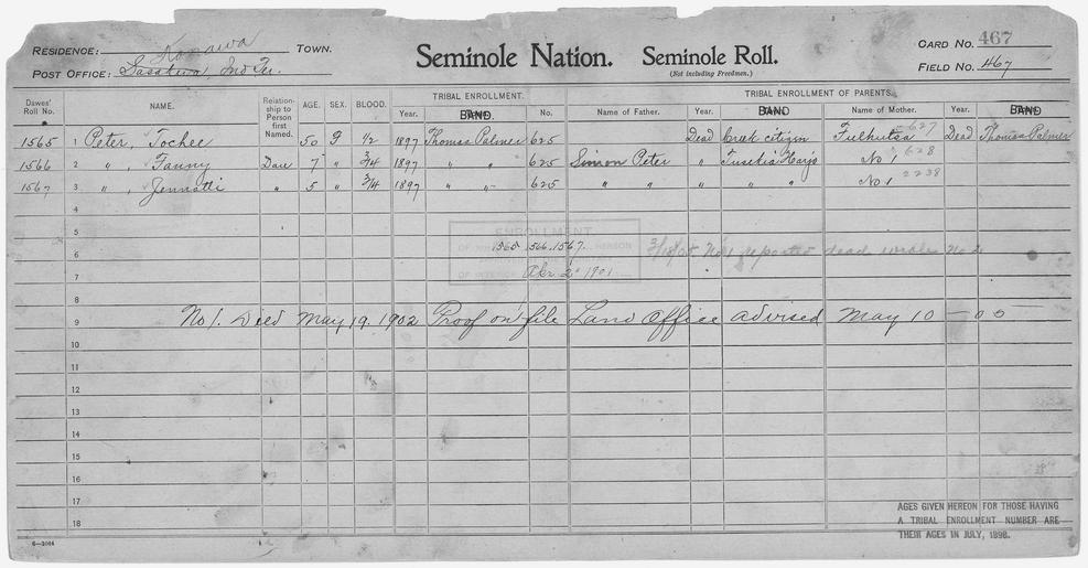 | Keywords: Enrollment for Seminole Census Card 467 - NARA - 268041.tif Scope and content Name Fulhutsa Type Parent Sex Female City of Residence tp Name Fanny Peter Type By Blood Age 7 Sex Female Degree Indian Blood 3/4 Roll Number 1566 City of Residence tp Name Jennatti Peter Type By Blood Age 5 Sex Female Degree Indian Blood 3/4 Roll Number 1567 City of Residence tp Name Simon Peter Type Parent Sex Male City of Residence th Name Tochee Peter Type By Blood Age 50 Sex Female Degree Indian Blood 1/2 Roll Number 1565 City of Residence tp General notes 268041 Local identifier 75-53A-SEMINOLE 467 Department of the Interior Office of Indian Affairs Office of the Commissioner to the Five Civilized Tribes 1893 - 1914 NARA's Southwest Region Fort Worth NRFA 1400 John Burgess Drive Fort Worth TX 76140 Record group Record Group 75 Records of the Bureau of Indian Affairs 1793 - 1999 Record group ARC 404 Enrollment Cards compiled 1898 - 1914 Series ARC 251747 File unit File unit ARC Variant control numbers NAIL Control Number NRFF-75-53A-32705<br /> NAIL Control Number NRFF-75-53A-44013<br /> NAIL Control Number NRFF-75-53A-44014<br /> NAIL Control Number NRFF-75-53A-44033<br /> NAIL Control Number NRFF-75-53A-44035<br /> NAIL Control Number NRFF-75-53A-SEMINOLE 467 yes Other versions <gallery> File Enrollment_for_Seminole_Census_Card_467_-_NARA_-_268041 tif tif File Enrollment_for_Seminole_Census_Card_467_-_NARA_-_268041 jpg jpg </gallery> NARA-cooperation PD-USGov Seminole census cards NARA TIF images with categorized JPGs |