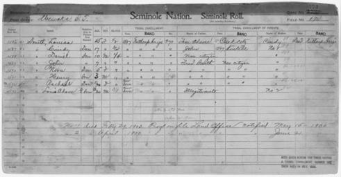 | Keywords: Enrollment for Seminole Census Card 474 - NARA - 268048.jpg Scope and content Name Tom Adams Type Parent Sex Male City of Residence Creek Name Cindy Type Parent Sex Female City of Residence nh Name Cindy Smith Type By Blood Age 17 Sex Female Degree Indian Blood 3/4 Roll Number 1587 City of Residence nh Name Daniel Smith Type By Blood Age 10 Sex Male Degree Indian Blood 1/4 Roll Number 1588 City of Residence nh Name Fred Smith Type Parent Sex Male Name Henry Smith Type By Blood Age 3 Sex Male Degree Indian Blood 1/4 Roll Number 1591 City of Residence nh Name John Smith Type By Blood Age 7 Sex Male Degree Indian Blood 1/4 Roll Number 1589 City of Residence nh Name Louis Adam Smith Type By Blood Age 1 Sex Male Degree Indian Blood 3/8 Roll Number 1593 City of Residence nh Name Louisa Smith Type By Blood Age 45 Sex Female Degree Indian Blood 1/2 Roll Number 1586 City of Residence nh Name Nora Smith Type By Blood Age 5 Sex Female Degree Indian Blood 1/4 Roll Number 1590 City of Residence nh Name Rachael Smith Type By Blood Age 1 Sex Female Degree Indian Blood 1/4 Roll Number 1592 City of Residence nh General notes 268048 Local identifier 75-53A-SEMINOLE 474 Department of the Interior Office of Indian Affairs Office of the Commissioner to the Five Civilized Tribes 1893 - 1914 NARA's Southwest Region Fort Worth NRFA 1400 John Burgess Drive Fort Worth TX 76140 Record group Record Group 75 Records of the Bureau of Indian Affairs 1793 - 1999 Record group ARC 404 Enrollment Cards compiled 1898 - 1914 Series ARC 251747 File unit File unit ARC Variant control numbers NAIL Control Number NRFF-75-53A-22752<br /> NAIL Control Number NRFF-75-53A-28237<br /> NAIL Control Number NRFF-75-53A-47205<br /> NAIL Control Number NRFF-75-53A-47208<br /> NAIL Control Number NRFF-75-53A-47238<br /> NAIL Control Number NRFF-75-53A-47257<br /> NAIL Control Number NRFF-75-53A-47288<br /> NAIL Control Number NRFF-75-53A-47319<br /> NAIL Control Number NRFF-75-53A-47325<br /> NAIL Control Number NRFF-75-53A-47388<br /> NAIL Control Number NRFF-75-53A-47395<br /> NAIL Control Number NRFF-75-53A-SEMINOLE 474 Other versions <gallery> File Enrollment_for_Seminole_Census_Card_474_-_NARA_-_268048 tif tif File Enrollment_for_Seminole_Census_Card_474_-_NARA_-_268048 jpg jpg </gallery> NARA-cooperation PD-USGov Seminole census cards |