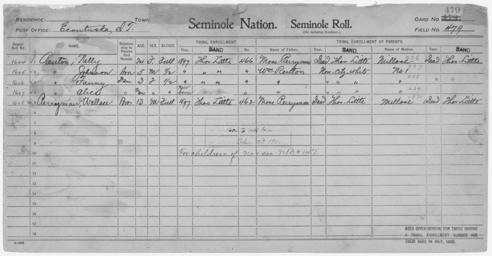 | Keywords: Enrollment for Seminole Census Card 479 - NARA - 268053.tif Scope and content Name Millose Type Parent Sex Female City of Residence tl Name Mose Perryman Type Parent Sex Male City of Residence tl Name Wallace Perryman Type By Blood Age 13 Sex Male Degree Indian Blood Full Roll Number 1608 City of Residence tl Name Alice Renton Type By Blood Age 1 Sex Female Degree Indian Blood 1/2 Roll Number 1607 City of Residence tl Name Fanny Renton Type By Blood Age 3 Sex Female Degree Indian Blood 1/2 Roll Number 1606 City of Residence tl Name Johnson Renton Type By Blood Age 5 Sex Male Degree Indian Blood 1/2 Roll Number 1605 City of Residence tl Name Nelly Renton Type By Blood Age 24 Sex Female Degree Indian Blood Full Roll Number 1604 City of Residence tl Name William Renton Type Parent Sex Male General notes 268053 Local identifier 75-53A-SEMINOLE 479 Department of the Interior Office of Indian Affairs Office of the Commissioner to the Five Civilized Tribes 1893 - 1914 NARA's Southwest Region Fort Worth NRFA 1400 John Burgess Drive Fort Worth TX 76140 Record group Record Group 75 Records of the Bureau of Indian Affairs 1793 - 1999 Record group ARC 404 Enrollment Cards compiled 1898 - 1914 Series ARC 251747 File unit File unit ARC Variant control numbers NAIL Control Number NRFF-75-53A-42171<br /> NAIL Control Number NRFF-75-53A-43927<br /> NAIL Control Number NRFF-75-53A-43990<br /> NAIL Control Number NRFF-75-53A-44935<br /> NAIL Control Number NRFF-75-53A-44936<br /> NAIL Control Number NRFF-75-53A-44937<br /> NAIL Control Number NRFF-75-53A-44938<br /> NAIL Control Number NRFF-75-53A-44939<br /> NAIL Control Number NRFF-75-53A-SEMINOLE 479 yes Other versions <gallery> File Enrollment_for_Seminole_Census_Card_479_-_NARA_-_268053 tif tif File Enrollment_for_Seminole_Census_Card_479_-_NARA_-_268053 jpg jpg </gallery> NARA-cooperation PD-USGov Seminole census cards NARA TIF images with categorized JPGs |