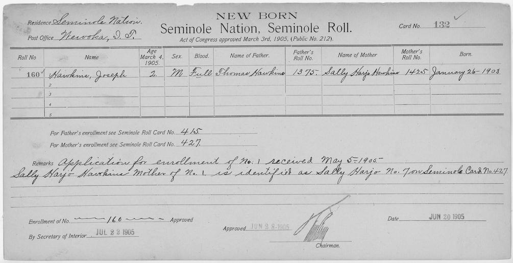 | Keywords: Enrollment for Seminole Census Card 132 - NARA - 267706.tif Scope and content Name Rosanna Type Parent Sex Female City of Residence wc Name Foklotka Wilson Type By Blood Age 28 Sex Female Degree Indian Blood Full Roll Number 458 City of Residence th Name John Wilson Type By Blood Age 35 Sex Male Degree Indian Blood Full Roll Number 457 City of Residence wc Name Lucinda Wilson Type By Blood Age 5 Sex Female Degree Indian Blood Full Roll Number 462 City of Residence th Name Melissa Wilson Type By Blood Age 15 Sex Female Degree Indian Blood Full Roll Number 459 City of Residence th Name Mollie Wilson Type By Blood Age 7 Sex Female Degree Indian Blood Full Roll Number 460 City of Residence th Name Munnah Wilson Type By Blood Age 1 Sex Female Degree Indian Blood Full Roll Number 463 City of Residence th Name Sallie Wilson Type By Blood Age 1 Sex Female Degree Indian Blood Full City of Residence th Name Yarner Wilson Type By Blood Age 6 Sex Female Degree Indian Blood Full Roll Number 461 City of Residence th Name Joseph Hawkins Type Newborn Age 2 Sex Male Degree Indian Blood FULL Roll Number 160 Post Office Wewoka General notes 267706 Local identifier 75-53A-SEMINOLE 132 Department of the Interior Office of Indian Affairs Office of the Commissioner to the Five Civilized Tribes 1893 - 1914 NARA's Southwest Region Fort Worth NRFA 1400 John Burgess Drive Fort Worth TX 76140 Record group Record Group 75 Records of the Bureau of Indian Affairs 1793 - 1999 Record group ARC 404 Enrollment Cards compiled 1898 - 1914 Series ARC 251747 File unit File unit ARC Variant control numbers NAIL Control Number NRFF-75-53A-45422<br /> NAIL Control Number NRFF-75-53A-51578<br /> NAIL Control Number NRFF-75-53A-51601<br /> NAIL Control Number NRFF-75-53A-51616<br /> NAIL Control Number NRFF-75-53A-51624<br /> NAIL Control Number NRFF-75-53A-51628<br /> NAIL Control Number NRFF-75-53A-51631<br /> NAIL Control Number NRFF-75-53A-51644<br /> NAIL Control Number NRFF-75-53A-51662<br /> NAIL Control Number NRFF-75-53A-52712<br /> NAIL Control Number NRFF-75-53A-SEMINOLE 132 yes Other versions <gallery> File Enrollment_for_Seminole_Census_Card_132_-_NARA_-_267706 tif tif File Enrollment_for_Seminole_Census_Card_132_-_NARA_-_267706 jpg jpg </gallery> NARA-cooperation PD-USGov Cherokee census cards NARA TIF images with categorized JPGs |