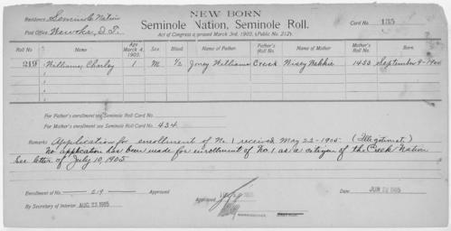 | Keywords: Enrollment for Seminole Census Card 135 - NARA - 267709.tif Scope and content Name Aharlak Harjo Type By Blood Age 38 Sex Male Degree Indian Blood Full Roll Number 468 City of Residence wc Name Cheparney Harjo Type By Blood Age 7 Sex Male Degree Indian Blood Full Roll Number 469 City of Residence th Name Lima Harjo Type By Blood Age 2 Sex Male Degree Indian Blood Full Roll Number 471 City of Residence th Name Mihi Harjo Type Parent Sex Female City of Residence th Name Mollie Harjo Type By Blood Age 4 Sex Female Degree Indian Blood Full Roll Number 470 City of Residence th Name Woxie Harjo Type Parent Sex Male City of Residence wc Name Charley Williams Type Newborn Age 1 Sex Male Degree Indian Blood 1/2 Roll Number 219 Post Office Wewoka General notes 267709 Local identifier 75-53A-SEMINOLE 135 Department of the Interior Office of Indian Affairs Office of the Commissioner to the Five Civilized Tribes 1893 - 1914 NARA's Southwest Region Fort Worth NRFA 1400 John Burgess Drive Fort Worth TX 76140 Record group Record Group 75 Records of the Bureau of Indian Affairs 1793 - 1999 Record group ARC 404 Enrollment Cards compiled 1898 - 1914 Series ARC 251747 File unit File unit ARC Variant control numbers NAIL Control Number NRFF-75-53A-34033<br /> NAIL Control Number NRFF-75-53A-34173<br /> NAIL Control Number NRFF-75-53A-34597<br /> NAIL Control Number NRFF-75-53A-34741<br /> NAIL Control Number NRFF-75-53A-34776<br /> NAIL Control Number NRFF-75-53A-35310<br /> NAIL Control Number NRFF-75-53A-52718<br /> NAIL Control Number NRFF-75-53A-SEMINOLE 135 yes Other versions <gallery> File Enrollment_for_Seminole_Census_Card_135_-_NARA_-_267709 tif tif File Enrollment_for_Seminole_Census_Card_135_-_NARA_-_267709 jpg jpg </gallery> NARA-cooperation PD-USGov Cherokee census cards NARA TIF images with categorized JPGs |