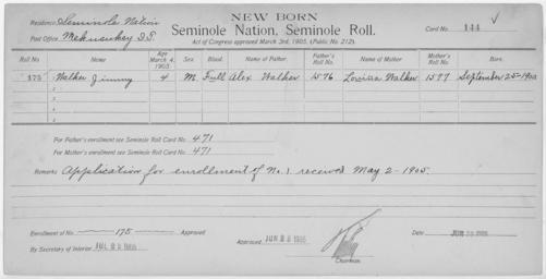 | Keywords: Enrollment for Seminole Census Card 144 - NARA - 267718.tif Scope and content Name Edmond Factor Type By Blood Age 5 Sex Male Degree Indian Blood 3/4 Roll Number 499 City of Residence tp Name Josey Factor Type By Blood Age 1 Sex Male Degree Indian Blood 3/4 Roll Number 500 City of Residence tp Name June Factor Type By Blood Age 25 Sex Male Degree Indian Blood Full Roll Number 497 City of Residence ee Name Lizzie Factor Type By Blood Age 27 Sex Female Degree Indian Blood 1/2 Roll Number 498 City of Residence tp Name Madelia Type Parent Sex Female City of Residence tp Name Jack Palmer Type Parent Sex Male City of Residence Creek Name Parsaka Type Parent Sex Male City of Residence o Name Sally Type Parent Sex Female City of Residence ee Name Jimmy Walker Type Newborn Age 4 Sex Male Degree Indian Blood FULL Roll Number 175 Post Office Mekusukey General notes 267718 Local identifier 75-53A-SEMINOLE 144 Department of the Interior Office of Indian Affairs Office of the Commissioner to the Five Civilized Tribes 1893 - 1914 NARA's Southwest Region Fort Worth NRFA 1400 John Burgess Drive Fort Worth TX 76140 Record group Record Group 75 Records of the Bureau of Indian Affairs 1793 - 1999 Record group ARC 404 Enrollment Cards compiled 1898 - 1914 Series ARC 251747 File unit File unit ARC Variant control numbers NAIL Control Number NRFF-75-53A-31176<br /> NAIL Control Number NRFF-75-53A-31224<br /> NAIL Control Number NRFF-75-53A-31225<br /> NAIL Control Number NRFF-75-53A-31233<br /> NAIL Control Number NRFF-75-53A-40284<br /> NAIL Control Number NRFF-75-53A-43508<br /> NAIL Control Number NRFF-75-53A-43624<br /> NAIL Control Number NRFF-75-53A-45629<br /> NAIL Control Number NRFF-75-53A-52730<br /> NAIL Control Number NRFF-75-53A-SEMINOLE 144 yes Other versions <gallery> File Enrollment_for_Seminole_Census_Card_144_-_NARA_-_267718 tif tif File Enrollment_for_Seminole_Census_Card_144_-_NARA_-_267718 jpg jpg </gallery> NARA-cooperation PD-USGov Cherokee census cards NARA TIF images with categorized JPGs |
