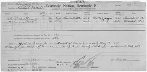 | Keywords: Enrollment for Seminole Census Card 149 - NARA - 267723.tif Scope and content Name Aleck Type By Blood Age 10 Sex Male Degree Indian Blood Full City of Residence th Name Chumsey Type By Blood Age 32 Sex Male Degree Indian Blood Full Roll Number 515 City of Residence wc Name Ellen Type By Blood Age 1 Sex Female Degree Indian Blood Full Roll Number 521 City of Residence th Name Elsa Type By Blood Age 8 Sex Female Degree Indian Blood Full Roll Number 518 City of Residence th Name Eufaula Type Parent Sex Male City of Residence th Name Ochle Harjo Type Parent Sex Male City of Residence yh Name Kenah Type By Blood Age 4 Sex Male Degree Indian Blood Full Roll Number 520 City of Residence th Name Meney Type By Blood Age 12 Sex Female Degree Indian Blood Full Roll Number 517 City of Residence th Name Silla Type By Blood Age 31 Sex Female Degree Indian Blood Full Roll Number 516 City of Residence th Name Sunday Type By Blood Age 6 Sex Male Degree Indian Blood Full Roll Number 519 City of Residence th Name Thomas Little Jr Type Newborn Age 3 Sex Male Degree Indian Blood FULL Roll Number 222 Post Office Sylvian Name David Little Type Newborn Age 1 Sex Male Degree Indian Blood FULL Roll Number 180 Post Office Sylvian General notes 267723 Local identifier 75-53A-SEMINOLE 149 Department of the Interior Office of Indian Affairs Office of the Commissioner to the Five Civilized Tribes 1893 - 1914 NARA's Southwest Region Fort Worth NRFA 1400 John Burgess Drive Fort Worth TX 76140 Record group Record Group 75 Records of the Bureau of Indian Affairs 1793 - 1999 Record group ARC 404 Enrollment Cards compiled 1898 - 1914 Series ARC 251747 File unit File unit ARC Variant control numbers NAIL Control Number NRFF-75-53A-22918<br /> NAIL Control Number NRFF-75-53A-28049<br /> NAIL Control Number NRFF-75-53A-30811<br /> NAIL Control Number NRFF-75-53A-30841<br /> NAIL Control Number NRFF-75-53A-31098<br /> NAIL Control Number NRFF-75-53A-34893<br /> NAIL Control Number NRFF-75-53A-38498<br /> NAIL Control Number NRFF-75-53A-41795<br /> NAIL Control Number NRFF-75-53A-46837<br /> NAIL Control Number NRFF-75-53A-48359<br /> NAIL Control Number NRFF-75-53A-52738<br /> NAIL Control Number NRFF-75-53A-52739<br /> NAIL Control Number NRFF-75-53A-SEMINOLE 149 yes Other versions <gallery> File Enrollment_for_Seminole_Census_Card_149_-_NARA_-_267723 tif tif File Enrollment_for_Seminole_Census_Card_149_-_NARA_-_267723 jpg jpg </gallery> NARA-cooperation PD-USGov Cherokee census cards NARA TIF images with categorized JPGs |