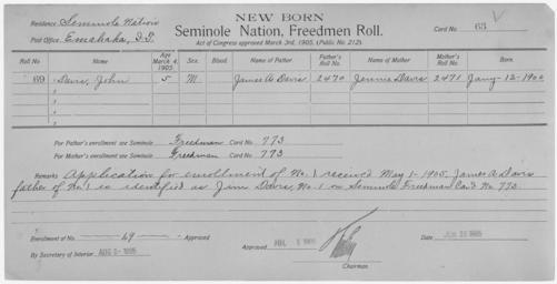 | Keywords: Enrollment for Seminole Census Card 63 - NARA - 267637.tif Scope and content Name Carpitche Type By Blood Age 35 Sex Male Degree Indian Blood Full Roll Number 230 City of Residence th Name Charlie Type By Blood Age 2 Sex Male Degree Indian Blood Full Roll Number 234 City of Residence th Name Cheparney Type By Blood Age 12 Sex Male Degree Indian Blood Full Roll Number 232 City of Residence th Name Parsuk Harjoche Type Parent Sex Male City of Residence th Name Ponas Hinehah Type Parent Sex Male City of Residence th Name Kizzer Type Parent Sex Female City of Residence th Name Lina Type By Blood Age 15 Sex Female Degree Indian Blood Full City of Residence th Name Lydia Type Parent Sex Female City of Residence th Name Mulcy Type By Blood Age 36 Sex Female Degree Indian Blood Full Roll Number 231 City of Residence th Name Sillah Type By Blood Age 8 Sex Female Degree Indian Blood Full Roll Number 233 City of Residence th Name John Davis Type Newborn Freedmen-Rejected Age 5 Sex Male Degree Indian Blood Not Reported Roll Number 69 Post Office Emahaka General notes 267637 Local identifier 75-53A-SEMINOLE 63 Department of the Interior Office of Indian Affairs Office of the Commissioner to the Five Civilized Tribes 1893 - 1914 NARA's Southwest Region Fort Worth NRFA 1400 John Burgess Drive Fort Worth TX 76140 Record group Record Group 75 Records of the Bureau of Indian Affairs 1793 - 1999 Record group ARC 404 Enrollment Cards compiled 1898 - 1914 Series ARC 251747 File unit File unit ARC Variant control numbers NAIL Control Number NRFF-75-53A-27179<br /> NAIL Control Number NRFF-75-53A-27479<br /> NAIL Control Number NRFF-75-53A-27596<br /> NAIL Control Number NRFF-75-53A-35397<br /> NAIL Control Number NRFF-75-53A-36351<br /> NAIL Control Number NRFF-75-53A-38806<br /> NAIL Control Number NRFF-75-53A-39489<br /> NAIL Control Number NRFF-75-53A-40236<br /> NAIL Control Number NRFF-75-53A-42751<br /> NAIL Control Number NRFF-75-53A-46843<br /> NAIL Control Number NRFF-75-53A-52899<br /> NAIL Control Number NRFF-75-53A-SEMINOLE 63 yes Other versions <gallery> File Enrollment_for_Seminole_Census_Card_63_-_NARA_-_267637 tif tif File Enrollment_for_Seminole_Census_Card_63_-_NARA_-_267637 jpg jpg </gallery> NARA-cooperation PD-USGov Cherokee census cards Seminole census cards NARA TIF images with categorized JPGs |