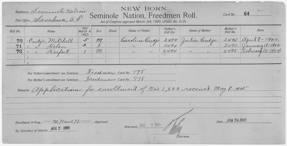 Keywords: Enrollment for Seminole Census Card 64 - NARA - 267638.tif Scope and content Name Louis Catcher Type Parent Sex Male City of Residence tp Name Cotcha Holatka Type Parent Sex Male City of Residence tp Name Chepon Hotulke Type By Blood Age 32 Sex Male Degree Indian Blood Full Roll Number 235 City of Residence tp Name Daniel Hotulke Type By Blood Age 3 Sex Male Degree Indian Blood Full Roll Number 237 City of Residence ee Name Hepsey Hotulke Type By Blood Age 1 Sex Female Degree Indian Blood Full Roll Number 238 City of Residence ee Name Louisa Hotulke Type By Blood Age 32 Sex Female Degree Indian Blood Full Roll Number 236 City of Residence ee Name Wisochey Hotulke Type By Blood Age 1 Sex Female Degree Indian Blood Full City of Residence ee Name Suwelage Type Parent Sex Female City of Residence tp Name Mitchell Cudjo Type Newborn Freedmen-Rejected Age 5 Sex Male Degree Indian Blood Not Reported Roll Number 70 Post Office Sasakwa Name Helen Cudjo Type Newborn Freedmen-Rejected Age 3 Sex Female Degree Indian Blood Not Reported Roll Number 71 Post Office Sasakwa Name Kerfort Cudjo Type Newborn Freedmen-Rejected Age 1 Sex Male Degree Indian Blood Not Reported Roll Number 72 Post Office Sasakwa General notes 267638 Local identifier 75-53A-SEMINOLE 64 Department of the Interior Office of Indian Affairs Office of the Commissioner to the Five Civilized Tribes 1893 - 1914 NARA's Southwest Region Fort Worth NRFA 1400 John Burgess Drive Fort Worth TX 76140 Record group Record Group 75 Records of the Bureau of Indian Affairs 1793 - 1999 Record group ARC 404 Enrollment Cards compiled 1898 - 1914 Series ARC 251747 File unit File unit ARC Variant control numbers NAIL Control Number NRFF-75-53A-27370<br /> NAIL Control Number NRFF-75-53A-36545<br /> NAIL Control Number NRFF-75-53A-36787<br /> NAIL Control Number NRFF-75-53A-36788<br /> NAIL Control Number NRFF-75-53A-36789<br /> NAIL Control Number NRFF-75-53A-36790<br /> NAIL Control Number NRFF-75-53A-36791<br /> NAIL Control Number NRFF-75-53A-48458<br /> NAIL Control Number NRFF-75-53A-52900<br /> NAIL Control Number NRFF-75-53A-52901<br /> NAIL Control Number NRFF-75-53A-52902<br /> NAIL Control Number NRFF-75-53A-SEMINOLE 64 yes Other versions <gallery> File Enrollment_for_Seminole_Census_Card_64_-_NARA_-_267638 tif tif File Enrollment_for_Seminole_Census_Card_64_-_NARA_-_267638 jpg jpg </gallery> NARA-cooperation PD-USGov Cherokee census cards Seminole census cards NARA TIF images with categorized JPGs |