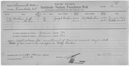 | Keywords: Enrollment for Seminole Census Card 73 - NARA - 267647.tif Scope and content Name Fanny Type Parent Sex Female City of Residence tp Name Fous Harjo Type Parent Sex Male City of Residence tp Name Betty Palmer Type By Blood Age 30 Sex Female Degree Indian Blood Full Roll Number 268 City of Residence tp Name Lucy Palmer Type By Blood Age 5 Sex Female Degree Indian Blood 3/4 Roll Number 269 City of Residence tp Name Mamie Palmer Type By Blood Age 1 Sex Female Degree Indian Blood 3/4 Roll Number 271 City of Residence tp Name Maro Palmer Type Parent Sex Male City of Residence Creek Name Sephor Palmer Type By Blood Age 28 Sex Male Degree Indian Blood 1/2 Roll Number 267 City of Residence tp Name Yarnah Palmer Type By Blood Age 3 Sex Female Degree Indian Blood 3/4 Roll Number 270 City of Residence tp Name Tekoska Type Parent Sex Female City of Residence tp Name Jeff Barkus Type Newborn Freedmen-Rejected Age 5 Sex Male Degree Indian Blood Not Reported Roll Number 118 Post Office Emahaka Name Naman Barkus Type Newborn Freedmen-Rejected Age 1 Sex Male Degree Indian Blood Not Reported Roll Number 119 Post Office Emahaka General notes 267647 Local identifier 75-53A-SEMINOLE 73 Department of the Interior Office of Indian Affairs Office of the Commissioner to the Five Civilized Tribes 1893 - 1914 NARA's Southwest Region Fort Worth NRFA 1400 John Burgess Drive Fort Worth TX 76140 Record group Record Group 75 Records of the Bureau of Indian Affairs 1793 - 1999 Record group ARC 404 Enrollment Cards compiled 1898 - 1914 Series ARC 251747 File unit File unit ARC Variant control numbers NAIL Control Number NRFF-75-53A-31299<br /> NAIL Control Number NRFF-75-53A-34341<br /> NAIL Control Number NRFF-75-53A-43499<br /> NAIL Control Number NRFF-75-53A-43521<br /> NAIL Control Number NRFF-75-53A-43523<br /> NAIL Control Number NRFF-75-53A-43524<br /> NAIL Control Number NRFF-75-53A-43530<br /> NAIL Control Number NRFF-75-53A-43540<br /> NAIL Control Number NRFF-75-53A-48851<br /> NAIL Control Number NRFF-75-53A-52914<br /> NAIL Control Number NRFF-75-53A-52915<br /> NAIL Control Number NRFF-75-53A-SEMINOLE 73 yes Other versions <gallery> File Enrollment_for_Seminole_Census_Card_73_-_NARA_-_267647 tif tif File Enrollment_for_Seminole_Census_Card_73_-_NARA_-_267647 jpg jpg </gallery> NARA-cooperation PD-USGov Cherokee census cards Seminole census cards NARA TIF images with categorized JPGs |