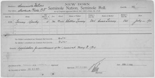 | Keywords: Enrollment for Seminole Census Card 86 - NARA - 267660.jpg Scope and content Name Nocus Ika Type Parent Sex Male City of Residence sb Name Jim Walker Type Parent Sex Male City of Residence nh Name Kissie Walker Type By Blood Age 9 Sex Female Degree Indian Blood Full Roll Number 304 City of Residence tp Name Leah Walker Type By Blood Age 30 Sex Female Degree Indian Blood Full Roll Number 302 City of Residence tp Name Lucinda Walker Type By Blood Age 15 Sex Female Degree Indian Blood Full Roll Number 303 City of Residence tp Name Sam Walker Type By Blood Age 35 Sex Male Degree Indian Blood Full Roll Number 301 City of Residence nh Name Sandy Larney Type Newborn Age 5 Sex Male Degree Indian Blood FULL Roll Number 110 Post Office Keokuk Falls Name Ruthie Davis Type Newborn Freedmen-Rejected Age 4 Sex Female Degree Indian Blood Not Reported Roll Number 91 Post Office Wewoka General notes 267660 Local identifier 75-53A-SEMINOLE 86 Department of the Interior Office of Indian Affairs Office of the Commissioner to the Five Civilized Tribes 1893 - 1914 NARA's Southwest Region Fort Worth NRFA 1400 John Burgess Drive Fort Worth TX 76140 Record group Record Group 75 Records of the Bureau of Indian Affairs 1793 - 1999 Record group ARC 404 Enrollment Cards compiled 1898 - 1914 Series ARC 251747 File unit File unit ARC Variant control numbers NAIL Control Number NRFF-75-53A-37031<br /> NAIL Control Number NRFF-75-53A-50500<br /> NAIL Control Number NRFF-75-53A-50508<br /> NAIL Control Number NRFF-75-53A-50510<br /> NAIL Control Number NRFF-75-53A-50516<br /> NAIL Control Number NRFF-75-53A-50538<br /> NAIL Control Number NRFF-75-53A-52647<br /> NAIL Control Number NRFF-75-53A-52933<br /> NAIL Control Number NRFF-75-53A-SEMINOLE 86 Other versions <gallery> File Enrollment_for_Seminole_Census_Card_86_-_NARA_-_267660 tif tif File Enrollment_for_Seminole_Census_Card_86_-_NARA_-_267660 jpg jpg </gallery> NARA-cooperation PD-USGov Cherokee census cards |