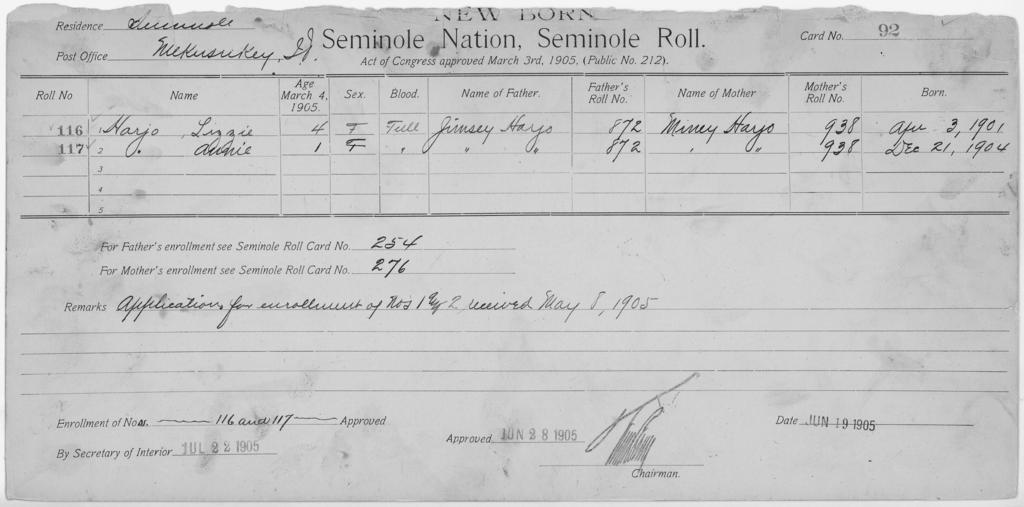 | Keywords: Enrollment for Seminole Census Card 92 - NARA - 267666.jpg Scope and content Name Charlie Emarther Type Parent Sex Male City of Residence yh Name Artus Harjo Type By Blood Age 65 Sex Male Degree Indian Blood Full City of Residence th Name Ishitchee Harjo Type By Blood Age 45 Sex Female Degree Indian Blood Full Roll Number 319 City of Residence th Name Lina Harjo Type By Blood Age 18 Sex Female Degree Indian Blood Full Roll Number 320 City of Residence th Name Billy Mingo Type By Blood Age 10 Sex Male Degree Indian Blood Full Roll Number 321 City of Residence th Name Jennie Mingo Type By Blood Age 17 Sex Female Degree Indian Blood Full Roll Number 322 City of Residence th Name Lizzie Harjo Type Newborn Age 4 Sex Female Degree Indian Blood FULL Roll Number 116 Post Office Mekusukey Name Annie Harjo Type Newborn Age 1 Sex Female Degree Indian Blood FULL Roll Number 117 Post Office Mekusukey Name Dollie Doser Type Newborn Freedmen-Rejected Age 2 Sex Female Degree Indian Blood Not Reported Roll Number 129 Post Office Mikuaukey General notes 267666 Local identifier 75-53A-SEMINOLE 92 Department of the Interior Office of Indian Affairs Office of the Commissioner to the Five Civilized Tribes 1893 - 1914 NARA's Southwest Region Fort Worth NRFA 1400 John Burgess Drive Fort Worth TX 76140 Record group Record Group 75 Records of the Bureau of Indian Affairs 1793 - 1999 Record group ARC 404 Enrollment Cards compiled 1898 - 1914 Series ARC 251747 File unit File unit ARC Variant control numbers NAIL Control Number NRFF-75-53A-30874<br /> NAIL Control Number NRFF-75-53A-34105<br /> NAIL Control Number NRFF-75-53A-34439<br /> NAIL Control Number NRFF-75-53A-34598<br /> NAIL Control Number NRFF-75-53A-42207<br /> NAIL Control Number NRFF-75-53A-42211<br /> NAIL Control Number NRFF-75-53A-52654<br /> NAIL Control Number NRFF-75-53A-52655<br /> NAIL Control Number NRFF-75-53A-52940<br /> NAIL Control Number NRFF-75-53A-SEMINOLE 92 Other versions <gallery> File Enrollment_for_Seminole_Census_Card_92_-_NARA_-_267666 tif tif File Enrollment_for_Seminole_Census_Card_92_-_NARA_-_267666 jpg jpg </gallery> NARA-cooperation PD-USGov Cherokee census cards |
