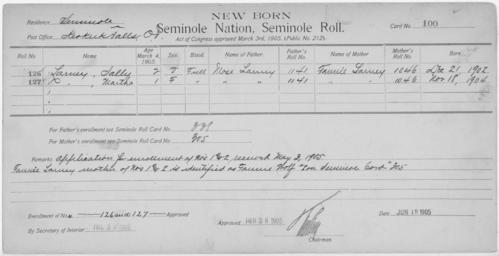 | Keywords: Enrollment for Seminole Census Card 100 - NARA - 267674.jpg Scope and content Name Cookogee Type Parent Sex Male City of Residence tp Name Linda Harjo Type By Blood Age 35 Sex Female Degree Indian Blood Full Roll Number 350 City of Residence yh Name Woxie Harjo Type By Blood Age 33 Sex Male Degree Indian Blood Full Roll Number 349 City of Residence th Name Tusekia Type Parent Sex Male Roll Number 350 City of Residence yh Name Sally Larney Type Newborn Age 2 Sex Female Degree Indian Blood FULL Roll Number 126 Post Office Keokuk Falls Name Martha Larney Type Newborn Age 1 Sex Female Degree Indian Blood FULL Roll Number 127 Post Office Keokuk Falls General notes 267674 Local identifier 75-53A-SEMINOLE 100 Department of the Interior Office of Indian Affairs Office of the Commissioner to the Five Civilized Tribes 1893 - 1914 NARA's Southwest Region Fort Worth NRFA 1400 John Burgess Drive Fort Worth TX 76140 Record group Record Group 75 Records of the Bureau of Indian Affairs 1793 - 1999 Record group ARC 404 Enrollment Cards compiled 1898 - 1914 Series ARC 251747 File unit File unit ARC Variant control numbers NAIL Control Number NRFF-75-53A-28787<br /> NAIL Control Number NRFF-75-53A-34602<br /> NAIL Control Number NRFF-75-53A-35309<br /> NAIL Control Number NRFF-75-53A-50196<br /> NAIL Control Number NRFF-75-53A-52668<br /> NAIL Control Number NRFF-75-53A-52669<br /> NAIL Control Number NRFF-75-53A-SEMINOLE 100 Other versions <gallery> File Enrollment_for_Seminole_Census_Card_100_-_NARA_-_267674 tif tif File Enrollment_for_Seminole_Census_Card_100_-_NARA_-_267674 jpg jpg </gallery> NARA-cooperation PD-USGov Cherokee census cards |