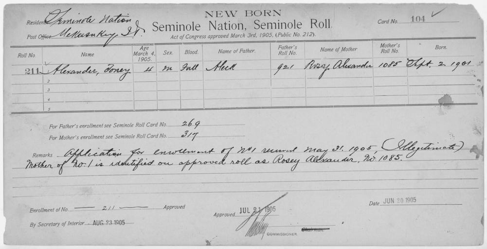 | Keywords: Enrollment for Seminole Census Card 104 - NARA - 267678.jpg Scope and content Name Mary Bean Type Parent Sex Female City of Residence th Name Mollie Blue Type Parent Sex Female City of Residence th Name Amanda Coker Type By Blood Age 5 Sex Female Degree Indian Blood 1/2 Roll Number 363 City of Residence th Name Chippy Coker Type By Blood Age 12 Sex Male Degree Indian Blood 1/2 Roll Number 360 City of Residence th Name Cooper Coker Type By Blood Age 9 Sex Male Degree Indian Blood 1/2 Roll Number 366 City of Residence th Name David Coker Type Parent Sex Male City of Residence Creek Name Endle Coker Type By Blood Age 2 Sex Male Degree Indian Blood 1/2 Roll Number 365 City of Residence th Name Hettie Coker Type By Blood Age 28 Sex Female Degree Indian Blood Full Roll Number 359 City of Residence th Name Kissie Coker Type By Blood Age 3 Sex Female Degree Indian Blood 1/2 Roll Number 364 City of Residence th Name Minnie Coker Type By Blood Age 9 Sex Female Degree Indian Blood 1/2 Roll Number 361 City of Residence th Name Woxie Emarthar Type Parent Sex Male City of Residence th Name Toney Alexander Type Newborn Age 4 Sex Male Degree Indian Blood FULL Roll Number 211 Post Office Mekusukey General notes 267678 Local identifier 75-53A-SEMINOLE 104 Department of the Interior Office of Indian Affairs Office of the Commissioner to the Five Civilized Tribes 1893 - 1914 NARA's Southwest Region Fort Worth NRFA 1400 John Burgess Drive Fort Worth TX 76140 Record group Record Group 75 Records of the Bureau of Indian Affairs 1793 - 1999 Record group ARC 404 Enrollment Cards compiled 1898 - 1914 Series ARC 251747 File unit File unit ARC Variant control numbers NAIL Control Number NRFF-75-53A-24221<br /> NAIL Control Number NRFF-75-53A-25250<br /> NAIL Control Number NRFF-75-53A-28420<br /> NAIL Control Number NRFF-75-53A-28429<br /> NAIL Control Number NRFF-75-53A-28433<br /> NAIL Control Number NRFF-75-53A-28437<br /> NAIL Control Number NRFF-75-53A-28441<br /> NAIL Control Number NRFF-75-53A-28450<br /> NAIL Control Number NRFF-75-53A-28455<br /> NAIL Control Number NRFF-75-53A-28482<br /> NAIL Control Number NRFF-75-53A-30871<br /> NAIL Control Number NRFF-75-53A-52674<br /> NAIL Control Number NRFF-75-53A-SEMINOLE 104 Other versions <gallery> File Enrollment_for_Seminole_Census_Card_104_-_NARA_-_267678 tif tif File Enrollment_for_Seminole_Census_Card_104_-_NARA_-_267678 jpg jpg </gallery> NARA-cooperation PD-USGov Cherokee census cards |