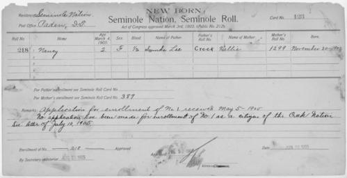 | Keywords: Enrollment for Seminole Census Card 123 - NARA - 267697.jpg Scope and content Name Concharty Type Parent Sex Male City of Residence yh Name George Davis Type By Blood Age 19 Sex Male Degree Indian Blood Full Roll Number 423 City of Residence ee Name Jennie Davis Type By Blood Age 22 Sex Female Degree Indian Blood Full Roll Number 424 City of Residence th Name Legus Davis Type By Blood Age 4 Sex Male Degree Indian Blood Full Roll Number 427 City of Residence ee Name Lula Davis Type By Blood Age 1 Sex Female Degree Indian Blood Full Roll Number 428 City of Residence th Name Hotogee Type Parent Sex Female City of Residence th Name Kiltkoge Type Parent Sex Female City of Residence ee Name Ned Lustey Type By Blood Age 5 Sex Male Degree Indian Blood Full Roll Number 42 City of Residence th Name Thomas Lustey Type By Blood Age 7 Sex Male Degree Indian Blood Full Roll Number 425 City of Residence th Name Punlustey Type Parent Sex Male City of Residence ee Name Dave Tulsa Type Parent Sex Male City of Residence ee Name Nancy Type Newborn Age 2 Sex Female Degree Indian Blood 1/2 Roll Number 218 Post Office Paden General notes 267697 Local identifier 75-53A-SEMINOLE 123 Department of the Interior Office of Indian Affairs Office of the Commissioner to the Five Civilized Tribes 1893 - 1914 NARA's Southwest Region Fort Worth NRFA 1400 John Burgess Drive Fort Worth TX 76140 Record group Record Group 75 Records of the Bureau of Indian Affairs 1793 - 1999 Record group ARC 404 Enrollment Cards compiled 1898 - 1914 Series ARC 251747 File unit File unit ARC Variant control numbers NAIL Control Number NRFF-75-53A-28664<br /> NAIL Control Number NRFF-75-53A-29691<br /> NAIL Control Number NRFF-75-53A-29742<br /> NAIL Control Number NRFF-75-53A-29813<br /> NAIL Control Number NRFF-75-53A-29843<br /> NAIL Control Number NRFF-75-53A-36782<br /> NAIL Control Number NRFF-75-53A-38664<br /> NAIL Control Number NRFF-75-53A-40219<br /> NAIL Control Number NRFF-75-53A-40220<br /> NAIL Control Number NRFF-75-53A-44747<br /> NAIL Control Number NRFF-75-53A-50126<br /> NAIL Control Number NRFF-75-53A-52700<br /> NAIL Control Number NRFF-75-53A-SEMINOLE 123 Other versions <gallery> File Enrollment_for_Seminole_Census_Card_123_-_NARA_-_267697 tif tif File Enrollment_for_Seminole_Census_Card_123_-_NARA_-_267697 jpg jpg </gallery> NARA-cooperation PD-USGov Cherokee census cards |