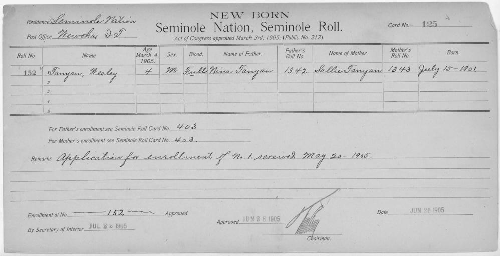 | Keywords: Enrollment for Seminole Census Card 125 - NARA - 267699.jpg Scope and content Name Alec Type By Blood Age 2 Sex Male Degree Indian Blood Full Roll Number 436 City of Residence yh Name Charley Amartha Type Parent Sex Male City of Residence yh Name Cheparney Type By Blood Age 4 Sex Male Degree Indian Blood Full Roll Number 434 City of Residence yh Name Chosey Type By Blood Age 7 Sex Male Degree Indian Blood Full Roll Number 434 City of Residence yh Name Micco Harjo Type Parent Sex Male City of Residence th Name Henny Type By Blood Age 28 Sex Female Degree Indian Blood Full Roll Number 431 City of Residence yh Name Losey Hoke Type Parent Sex Female City of Residence th Name Jonah Type By Blood Age 1 Sex Male Degree Indian Blood Full Roll Number 437 City of Residence yh Name Paney Type By Blood Age 13 Sex Male Degree Indian Blood Full Roll Number 432 City of Residence yh Name Putkeh Type By Blood Age 11 Sex Male Degree Indian Blood Full Roll Number 433 City of Residence yh Name Seharney Type By Blood Age 30 Sex Male Degree Indian Blood Full Roll Number 430 City of Residence yh Name Wesley Tanyan Type Newborn Age 4 Sex Male Degree Indian Blood FULL Roll Number 152 Post Office Wewoka General notes 267699 Local identifier 75-53A-SEMINOLE 125 Department of the Interior Office of Indian Affairs Office of the Commissioner to the Five Civilized Tribes 1893 - 1914 NARA's Southwest Region Fort Worth NRFA 1400 John Burgess Drive Fort Worth TX 76140 Record group Record Group 75 Records of the Bureau of Indian Affairs 1793 - 1999 Record group ARC 404 Enrollment Cards compiled 1898 - 1914 Series ARC 251747 File unit File unit ARC Variant control numbers NAIL Control Number NRFF-75-53A-22913<br /> NAIL Control Number NRFF-75-53A-23077<br /> NAIL Control Number NRFF-75-53A-27597<br /> NAIL Control Number NRFF-75-53A-27992<br /> NAIL Control Number NRFF-75-53A-34738<br /> NAIL Control Number NRFF-75-53A-36042<br /> NAIL Control Number NRFF-75-53A-36488<br /> NAIL Control Number NRFF-75-53A-38017<br /> NAIL Control Number NRFF-75-53A-43543<br /> NAIL Control Number NRFF-75-53A-44758<br /> NAIL Control Number NRFF-75-53A-46437<br /> NAIL Control Number NRFF-75-53A-52703<br /> NAIL Control Number NRFF-75-53A-SEMINOLE 125 Other versions <gallery> File Enrollment_for_Seminole_Census_Card_125_-_NARA_-_267699 tif tif File Enrollment_for_Seminole_Census_Card_125_-_NARA_-_267699 jpg jpg </gallery> NARA-cooperation PD-USGov Cherokee census cards |