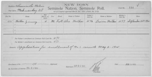 | Keywords: Enrollment for Seminole Census Card 144 - NARA - 267718.jpg Scope and content Name Edmond Factor Type By Blood Age 5 Sex Male Degree Indian Blood 3/4 Roll Number 499 City of Residence tp Name Josey Factor Type By Blood Age 1 Sex Male Degree Indian Blood 3/4 Roll Number 500 City of Residence tp Name June Factor Type By Blood Age 25 Sex Male Degree Indian Blood Full Roll Number 497 City of Residence ee Name Lizzie Factor Type By Blood Age 27 Sex Female Degree Indian Blood 1/2 Roll Number 498 City of Residence tp Name Madelia Type Parent Sex Female City of Residence tp Name Jack Palmer Type Parent Sex Male City of Residence Creek Name Parsaka Type Parent Sex Male City of Residence o Name Sally Type Parent Sex Female City of Residence ee Name Jimmy Walker Type Newborn Age 4 Sex Male Degree Indian Blood FULL Roll Number 175 Post Office Mekusukey General notes 267718 Local identifier 75-53A-SEMINOLE 144 Department of the Interior Office of Indian Affairs Office of the Commissioner to the Five Civilized Tribes 1893 - 1914 NARA's Southwest Region Fort Worth NRFA 1400 John Burgess Drive Fort Worth TX 76140 Record group Record Group 75 Records of the Bureau of Indian Affairs 1793 - 1999 Record group ARC 404 Enrollment Cards compiled 1898 - 1914 Series ARC 251747 File unit File unit ARC Variant control numbers NAIL Control Number NRFF-75-53A-31176<br /> NAIL Control Number NRFF-75-53A-31224<br /> NAIL Control Number NRFF-75-53A-31225<br /> NAIL Control Number NRFF-75-53A-31233<br /> NAIL Control Number NRFF-75-53A-40284<br /> NAIL Control Number NRFF-75-53A-43508<br /> NAIL Control Number NRFF-75-53A-43624<br /> NAIL Control Number NRFF-75-53A-45629<br /> NAIL Control Number NRFF-75-53A-52730<br /> NAIL Control Number NRFF-75-53A-SEMINOLE 144 Other versions <gallery> File Enrollment_for_Seminole_Census_Card_144_-_NARA_-_267718 tif tif File Enrollment_for_Seminole_Census_Card_144_-_NARA_-_267718 jpg jpg </gallery> NARA-cooperation PD-USGov Cherokee census cards |