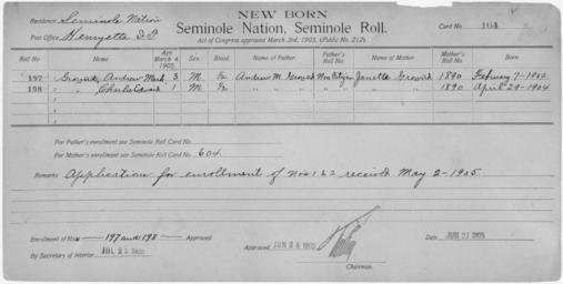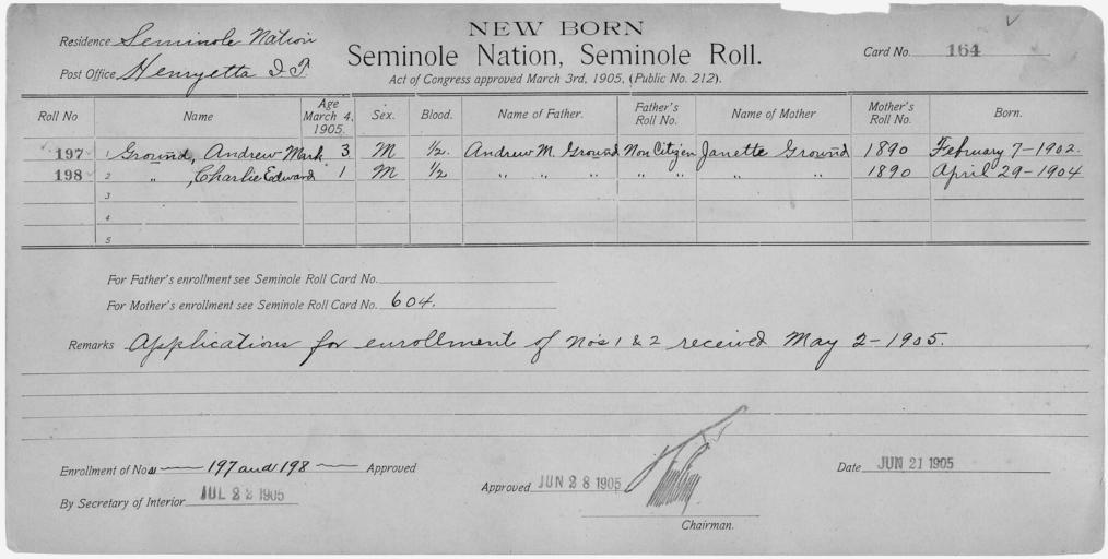 | Keywords: Enrollment for Seminole Census Card 164 - NARA - 267738.jpg Scope and content Name Joanna Brown Type By Blood Age 3 Sex Female Degree Indian Blood Full Roll Number 586 City of Residence th Name Johnnie Brown Type Parent Sex Male City of Residence tp Name Sammy Carpitche Type By Blood Age 14 Sex Male Degree Indian Blood Full Roll Number 583 City of Residence th Name Cookogee Type Parent Sex Male City of Residence tp Name Lina Type Parent Sex Female City of Residence th Name George Pilot Type By Blood Age 8 Sex Male Degree Indian Blood 1/2 Roll Number 585 City of Residence th Name Mary Pilot Type By Blood Age 11 Sex Female Degree Indian Blood 1/2 Roll Number 585 City of Residence th Name Tolomka Type By Blood Age 30 Sex Female Degree Indian Blood Full Roll Number 582 City of Residence th Name Andrew Mark Ground Type Newborn Age 3 Sex Male Degree Indian Blood 1/2 Roll Number 197 Post Office Henryetta Name Charlie Edward Ground Type Newborn Age 1 Sex Male Degree Indian Blood 1/2 Roll Number 198 Post Office Henryetta General notes 267738 Local identifier 75-53A-SEMINOLE 164 Department of the Interior Office of Indian Affairs Office of the Commissioner to the Five Civilized Tribes 1893 - 1914 NARA's Southwest Region Fort Worth NRFA 1400 John Burgess Drive Fort Worth TX 76140 Record group Record Group 75 Records of the Bureau of Indian Affairs 1793 - 1999 Record group ARC 404 Enrollment Cards compiled 1898 - 1914 Series ARC 251747 File unit File unit ARC Variant control numbers NAIL Control Number NRFF-75-53A-25803<br /> NAIL Control Number NRFF-75-53A-25823<br /> NAIL Control Number NRFF-75-53A-27181<br /> NAIL Control Number NRFF-75-53A-28788<br /> NAIL Control Number NRFF-75-53A-39490<br /> NAIL Control Number NRFF-75-53A-44171<br /> NAIL Control Number NRFF-75-53A-44172<br /> NAIL Control Number NRFF-75-53A-50006<br /> NAIL Control Number NRFF-75-53A-52765<br /> NAIL Control Number NRFF-75-53A-52766<br /> NAIL Control Number NRFF-75-53A-SEMINOLE 164 Other versions <gallery> File Enrollment_for_Seminole_Census_Card_164_-_NARA_-_267738 tif tif File Enrollment_for_Seminole_Census_Card_164_-_NARA_-_267738 jpg jpg </gallery> NARA-cooperation PD-USGov Cherokee census cards |