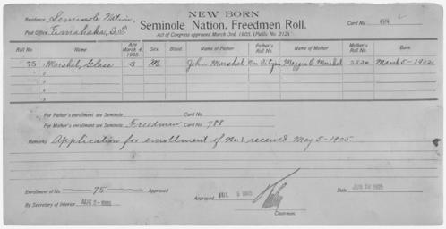 | Keywords: Enrollment for Seminole Census Card 68 - NARA - 267642.jpg Scope and content Name Arhalugy Type Parent Sex Male City of Residence tp Name Carpitche Fixico Type Parent Sex Male City of Residence nh Name Pin Harjo Type By Blood Age 55 Sex Male Degree Indian Blood Full Roll Number 249 City of Residence th Name Salina Harjo Type By Blood Age 17 Sex Female Degree Indian Blood Full Roll Number 251 City of Residence th Name Suthoye Type By Blood Age 60 Sex Female Degree Indian Blood Full Roll Number 250 City of Residence th Name Glass Marshal Type Newborn Freedmen-Rejected Age 3 Sex Male Degree Indian Blood Not Reported Roll Number 75 Post Office Emahaka General notes 267642 Local identifier 75-53A-SEMINOLE 68 Department of the Interior Office of Indian Affairs Office of the Commissioner to the Five Civilized Tribes 1893 - 1914 NARA's Southwest Region Fort Worth NRFA 1400 John Burgess Drive Fort Worth TX 76140 Record group Record Group 75 Records of the Bureau of Indian Affairs 1793 - 1999 Record group ARC 404 Enrollment Cards compiled 1898 - 1914 Series ARC 251747 File unit File unit ARC Variant control numbers NAIL Control Number NRFF-75-53A-23359<br /> NAIL Control Number NRFF-75-53A-31827<br /> NAIL Control Number NRFF-75-53A-34982<br /> NAIL Control Number NRFF-75-53A-35016<br /> NAIL Control Number NRFF-75-53A-48441<br /> NAIL Control Number NRFF-75-53A-52906<br /> NAIL Control Number NRFF-75-53A-SEMINOLE 68 Other versions <gallery> File Enrollment_for_Seminole_Census_Card_68_-_NARA_-_267642 tif tif File Enrollment_for_Seminole_Census_Card_68_-_NARA_-_267642 jpg jpg </gallery> NARA-cooperation PD-USGov Cherokee census cards Seminole census cards |