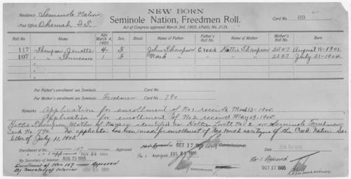 | Keywords: Enrollment for Seminole Census Card 69 - NARA - 267643.jpg Scope and content Name Bowlegs Type Parent Sex Male City of Residence th Name Ada Factor Type By Blood Age 3 Sex Female Degree Indian Blood Full Roll Number 254 City of Residence th Name Lizzie Factor Type By Blood Age 25 Sex Female Degree Indian Blood Full City of Residence th Name Mary Factor Type By Blood Age 2 Sex Female Degree Indian Blood Full Roll Number 253 City of Residence th Name Thomas Factor Type Parent Sex Male City of Residence tp Name Toney Factor Type By Blood Age 25 Sex Male Degree Indian Blood Full Roll Number 252 City of Residence tp Name Jenetta Thompson Type Newborn Freedmen-Rejected Age 4 Sex Female Degree Indian Blood Not Reported Roll Number 117 Post Office Okemah Name Tennessee Thompson Type Newborn Freedmen-Rejected Age 1 Sex Female Degree Indian Blood Not Reported Roll Number 107 Post Office Okemah General notes 267643 Local identifier 75-53A-SEMINOLE 69 Department of the Interior Office of Indian Affairs Office of the Commissioner to the Five Civilized Tribes 1893 - 1914 NARA's Southwest Region Fort Worth NRFA 1400 John Burgess Drive Fort Worth TX 76140 Record group Record Group 75 Records of the Bureau of Indian Affairs 1793 - 1999 Record group ARC 404 Enrollment Cards compiled 1898 - 1914 Series ARC 251747 File unit File unit ARC Variant control numbers NAIL Control Number NRFF-75-53A-25363<br /> NAIL Control Number NRFF-75-53A-31164<br /> NAIL Control Number NRFF-75-53A-31232<br /> NAIL Control Number NRFF-75-53A-31240<br /> NAIL Control Number NRFF-75-53A-31263<br /> NAIL Control Number NRFF-75-53A-31271<br /> NAIL Control Number NRFF-75-53A-52907<br /> NAIL Control Number NRFF-75-53A-52908<br /> NAIL Control Number NRFF-75-53A-SEMINOLE 69 Other versions <gallery> File Enrollment_for_Seminole_Census_Card_69_-_NARA_-_267643 tif tif File Enrollment_for_Seminole_Census_Card_69_-_NARA_-_267643 jpg jpg </gallery> NARA-cooperation PD-USGov Cherokee census cards Seminole census cards |
