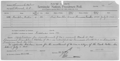 | Keywords: Enrollment for Seminole Census Card 70 - NARA - 267644.jpg Scope and content Name Bessie Factor Type By Blood Age 20 Sex Female Degree Indian Blood Full Roll Number 256 City of Residence yh Name Edward Factor Type By Blood Age 1 Sex Male Degree Indian Blood Full Roll Number 257 City of Residence yh Name Marchey Factor Type By Blood Age 23 Sex Male Degree Indian Blood Full Roll Number 255 City of Residence tp Name Thomas Factor Type Parent Sex Male City of Residence tp Name Totkus Harjo Type Parent Sex Male City of Residence yh Name Willie Franklin Type Newborn Freedmen-Rejected Age 4 Sex Male Degree Indian Blood Not Reported Roll Number 108 Post Office Okemah General notes 267644 Local identifier 75-53A-SEMINOLE 70 Department of the Interior Office of Indian Affairs Office of the Commissioner to the Five Civilized Tribes 1893 - 1914 NARA's Southwest Region Fort Worth NRFA 1400 John Burgess Drive Fort Worth TX 76140 Record group Record Group 75 Records of the Bureau of Indian Affairs 1793 - 1999 Record group ARC 404 Enrollment Cards compiled 1898 - 1914 Series ARC 251747 File unit File unit ARC Variant control numbers NAIL Control Number NRFF-75-53A-31167<br /> NAIL Control Number NRFF-75-53A-31177<br /> NAIL Control Number NRFF-75-53A-31235<br /> NAIL Control Number NRFF-75-53A-31264<br /> NAIL Control Number NRFF-75-53A-35185<br /> NAIL Control Number NRFF-75-53A-52909<br /> NAIL Control Number NRFF-75-53A-SEMINOLE 70 Other versions <gallery> File Enrollment_for_Seminole_Census_Card_70_-_NARA_-_267644 tif tif File Enrollment_for_Seminole_Census_Card_70_-_NARA_-_267644 jpg jpg </gallery> NARA-cooperation PD-USGov Cherokee census cards Seminole census cards |