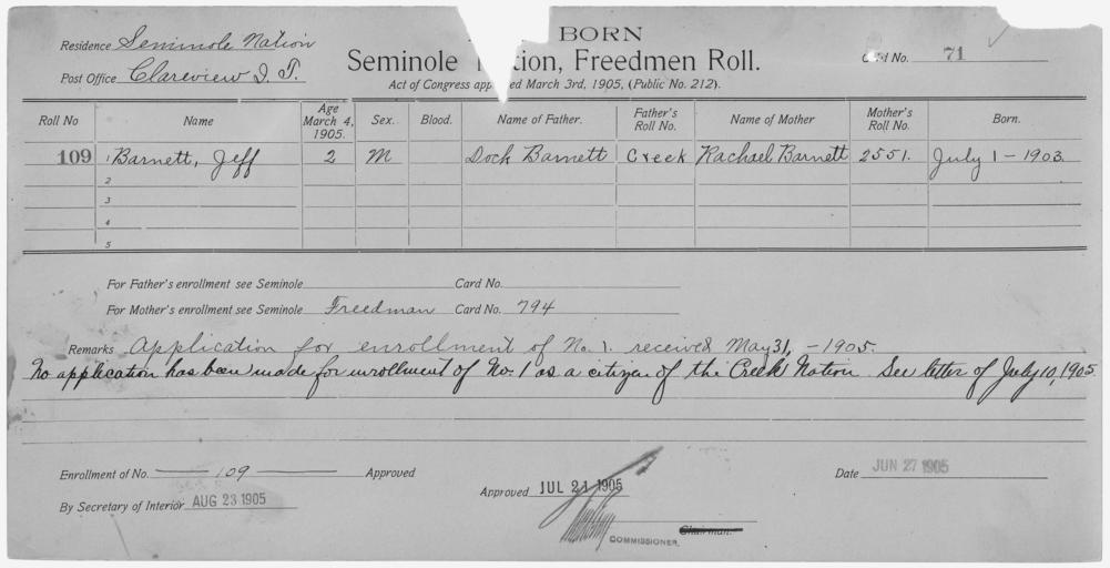 | Keywords: Enrollment for Seminole Census Card 71 - NARA - 267645.jpg Scope and content Name Arstaga Harjo Type By Blood Age 2 Sex Male Degree Indian Blood Full Roll Number 260 City of Residence th Name Peter Harjo Type By Blood Age 22 Sex Male Degree Indian Blood Full Roll Number 258 City of Residence th Name Pin Harjo Type Parent Sex Male City of Residence th Name Toge Harjo Type By Blood Age 18 Sex Female Degree Indian Blood Full Roll Number 259 City of Residence th Name Mellee Type Parent Sex Female City of Residence th Name Noska Type Parent Sex Male City of Residence th Name Suthoye Type Parent Sex Female City of Residence th Name Jeff Barnett Type Newborn Freedmen-Rejected Age 2 Sex Male Degree Indian Blood Not Reported Roll Number 109 Post Office Clareview General notes 267645 Local identifier 75-53A-SEMINOLE 71 Department of the Interior Office of Indian Affairs Office of the Commissioner to the Five Civilized Tribes 1893 - 1914 NARA's Southwest Region Fort Worth NRFA 1400 John Burgess Drive Fort Worth TX 76140 Record group Record Group 75 Records of the Bureau of Indian Affairs 1793 - 1999 Record group ARC 404 Enrollment Cards compiled 1898 - 1914 Series ARC 251747 File unit File unit ARC Variant control numbers NAIL Control Number NRFF-75-53A-34103<br /> NAIL Control Number NRFF-75-53A-34971<br /> NAIL Control Number NRFF-75-53A-34983<br /> NAIL Control Number NRFF-75-53A-35152<br /> NAIL Control Number NRFF-75-53A-41784<br /> NAIL Control Number NRFF-75-53A-43311<br /> NAIL Control Number NRFF-75-53A-48442<br /> NAIL Control Number NRFF-75-53A-52910<br /> NAIL Control Number NRFF-75-53A-SEMINOLE 71 Other versions <gallery> File Enrollment_for_Seminole_Census_Card_71_-_NARA_-_267645 tif tif File Enrollment_for_Seminole_Census_Card_71_-_NARA_-_267645 jpg jpg </gallery> NARA-cooperation PD-USGov Cherokee census cards Seminole census cards |