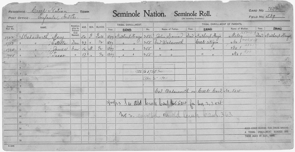 | Keywords: Enrollment for Seminole Census Card 529 - NARA - 268103.tif Scope and content Name Miley Type Parent Sex Female City of Residence nh Name John Spainard Type Parent Sex Male City of Residence nh Name Cad Wadsworth Type Parent Sex Male City of Residence Creek Name Estella Wadsworth Type By Blood Age 23 Sex Female Degree Indian Blood Full Roll Number 1723 City of Residence nh Name James Wadsworth Type By Blood Age 16 Sex Male Degree Indian Blood 1/2 Roll Number 1724 City of Residence nh Name Mary Wadsworth Type By Blood Age 50 Sex Female Degree Indian Blood Full Roll Number 1722 City of Residence nh Name Tasso Wadsworth Type By Blood Age 13 Sex Male Degree Indian Blood 1/2 Roll Number 1725 City of Residence nh General notes 268103 Local identifier 75-53A-SEMINOLE 529 Department of the Interior Office of Indian Affairs Office of the Commissioner to the Five Civilized Tribes 1893 - 1914 NARA's Southwest Region Fort Worth NRFA 1400 John Burgess Drive Fort Worth TX 76140 Record group Record Group 75 Records of the Bureau of Indian Affairs 1793 - 1999 Record group ARC 404 Enrollment Cards compiled 1898 - 1914 Series ARC 251747 File unit File unit ARC Variant control numbers NAIL Control Number NRFF-75-53A-42024<br /> NAIL Control Number NRFF-75-53A-47702<br /> NAIL Control Number NRFF-75-53A-50383<br /> NAIL Control Number NRFF-75-53A-50390<br /> NAIL Control Number NRFF-75-53A-50393<br /> NAIL Control Number NRFF-75-53A-50408<br /> NAIL Control Number NRFF-75-53A-50419<br /> NAIL Control Number NRFF-75-53A-SEMINOLE 529 yes Other versions <gallery> File Enrollment_for_Seminole_Census_Card_529_-_NARA_-_268103 tif tif File Enrollment_for_Seminole_Census_Card_529_-_NARA_-_268103 jpg jpg </gallery> NARA-cooperation PD-USGov Seminole census cards NARA TIF images with categorized JPGs |