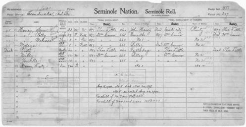 | Keywords: Enrollment for Seminole Census Card 207 - NARA - 267781.jpg Scope and content Name Fullodage Type Parent Sex Male City of Residence tl Name John Haney Type Parent Sex Male City of Residence Creek Name Luty Haney Type By Blood Age 1 Sex Female Degree Indian Blood Full Roll Number 721 City of Residence wc Name Melissa Haney Type By Blood Age 3 Sex Female Degree Indian Blood Full Roll Number 717 City of Residence wc Name Polly Haney Type By Blood Age 29 Sex Female Degree Indian Blood Full Roll Number 716 City of Residence wc Name Sam Haney Type By Blood Age 33 Sex Male Degree Indian Blood 1/2 Roll Number 715 City of Residence tl Name Milly Type By Blood Age 12 Sex Male Degree Indian Blood Full Roll Number 719 City of Residence wc Name Moleya Type By Blood Age 8 Sex Female Degree Indian Blood Full Roll Number 718 City of Residence wc Name Pinty Type Parent Sex Female City of Residence tl Name Pinty Type By Blood Age 60 Sex Female Degree Indian Blood Full City of Residence tl Name Yowelle Type By Blood Age 10 Sex Male Degree Indian Blood Full Roll Number 720 City of Residence wc General notes 267781 Local identifier 75-53A-SEMINOLE 207 Department of the Interior Office of Indian Affairs Office of the Commissioner to the Five Civilized Tribes 1893 - 1914 NARA's Southwest Region Fort Worth NRFA 1400 John Burgess Drive Fort Worth TX 76140 Record group Record Group 75 Records of the Bureau of Indian Affairs 1793 - 1999 Record group ARC 404 Enrollment Cards compiled 1898 - 1914 Series ARC 251747 File unit File unit ARC Variant control numbers NAIL Control Number NRFF-75-53A-32707<br /> NAIL Control Number NRFF-75-53A-33933<br /> NAIL Control Number NRFF-75-53A-33937<br /> NAIL Control Number NRFF-75-53A-33939<br /> NAIL Control Number NRFF-75-53A-33943<br /> NAIL Control Number NRFF-75-53A-33946<br /> NAIL Control Number NRFF-75-53A-42186<br /> NAIL Control Number NRFF-75-53A-42368<br /> NAIL Control Number NRFF-75-53A-44191<br /> NAIL Control Number NRFF-75-53A-44192<br /> NAIL Control Number NRFF-75-53A-52619<br /> NAIL Control Number NRFF-75-53A-SEMINOLE 207 Other versions <gallery> File Enrollment_for_Seminole_Census_Card_207_-_NARA_-_267781 tif tif File Enrollment_for_Seminole_Census_Card_207_-_NARA_-_267781 jpg jpg </gallery> NARA-cooperation PD-USGov Seminole census cards |