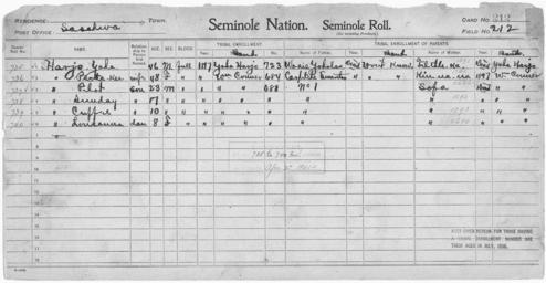 | Keywords: Enrollment for Seminole Census Card 212 - NARA - 267786.tif Scope and content Name Carpitche Emarther Type Parent Sex Male Name Cuffee Harjo Type By Blood Age 10 Sex Male Degree Indian Blood Full Roll Number 739 City of Residence wc Name Lousanna Harjo Type By Blood Age 8 Sex Female Degree Indian Blood Full Roll Number 740 City of Residence wc Name Petakee Harjo Type By Blood Age 48 Sex Female Degree Indian Blood Full Roll Number 736 City of Residence wc Name Pilot Harjo Type By Blood Age 23 Sex Male Degree Indian Blood Full Roll Number 737 City of Residence wc Name Sunday Harjo Type By Blood Age 17 Sex Male Degree Indian Blood Full Roll Number 738 City of Residence wc Name Yaha Harjo Type By Blood Age 46 Sex Male Degree Indian Blood Full Roll Number 735 City of Residence yh Name Kinnana Type Parent Sex Female City of Residence wc Name Sofa Type Parent Sex Female City of Residence wc Name Tilthleka Type Parent Sex Female City of Residence yh Name Woxie Yaholar Type Parent Sex Male General notes 267786 Local identifier 75-53A-SEMINOLE 212 Department of the Interior Office of Indian Affairs Office of the Commissioner to the Five Civilized Tribes 1893 - 1914 NARA's Southwest Region Fort Worth NRFA 1400 John Burgess Drive Fort Worth TX 76140 Record group Record Group 75 Records of the Bureau of Indian Affairs 1793 - 1999 Record group ARC 404 Enrollment Cards compiled 1898 - 1914 Series ARC 251747 File unit File unit ARC Variant control numbers NAIL Control Number NRFF-75-53A-30873<br /> NAIL Control Number NRFF-75-53A-34268<br /> NAIL Control Number NRFF-75-53A-34640<br /> NAIL Control Number NRFF-75-53A-34965<br /> NAIL Control Number NRFF-75-53A-34974<br /> NAIL Control Number NRFF-75-53A-35077<br /> NAIL Control Number NRFF-75-53A-35322<br /> NAIL Control Number NRFF-75-53A-38775<br /> NAIL Control Number NRFF-75-53A-47554<br /> NAIL Control Number NRFF-75-53A-49902<br /> NAIL Control Number NRFF-75-53A-52340<br /> NAIL Control Number NRFF-75-53A-SEMINOLE 212 yes Other versions <gallery> File Enrollment_for_Seminole_Census_Card_212_-_NARA_-_267786 tif tif File Enrollment_for_Seminole_Census_Card_212_-_NARA_-_267786 jpg jpg </gallery> NARA-cooperation PD-USGov Seminole census cards NARA TIF images with categorized JPGs |