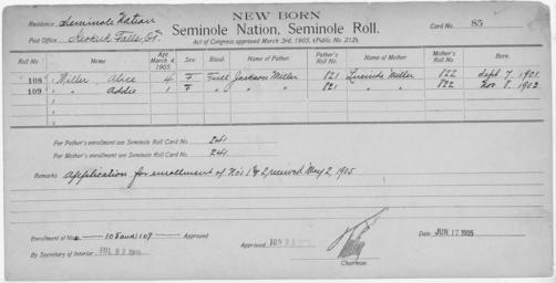 | Keywords: Enrollment for Seminole Census Card 85 - NARA - 267659.tif Scope and content Name Chumkah Type Parent Sex Female City of Residence tp Name Fous Harjo Type Parent Sex Male City of Residence tp Name Charlie Jefferson Type By Blood Age 20 Sex Male Degree Indian Blood Full Roll Number 298 City of Residence tp Name Chippie Jefferson Type By Blood Age 1 Sex Male Degree Indian Blood Full Roll Number 300 City of Residence tp Name Estoche Jefferson Type By Blood Age 1 Sex Male Degree Indian Blood Full City of Residence tp Name Selina Jefferson Type By Blood Age 20 Sex Female Degree Indian Blood Full Roll Number 299 City of Residence tp Name Thomas Jefferson Type Parent Sex Male City of Residence th Name Tokootska Type Parent Sex Female City of Residence tp Name Alice Miller Type Newborn Age 4 Sex Female Degree Indian Blood FULL Roll Number 108 Post Office Keokuk Falls Name Addie Miller Type Newborn Age 1 Sex Female Degree Indian Blood FULL Roll Number 109 Post Office Keokuk Falls Name Ollie Grayson Type Newborn Freedmen-Rejected Age 2 Sex Female Degree Indian Blood Not Reported Roll Number 111 Post Office Econtuchka General notes 267659 Local identifier 75-53A-SEMINOLE 85 Department of the Interior Office of Indian Affairs Office of the Commissioner to the Five Civilized Tribes 1893 - 1914 NARA's Southwest Region Fort Worth NRFA 1400 John Burgess Drive Fort Worth TX 76140 Record group Record Group 75 Records of the Bureau of Indian Affairs 1793 - 1999 Record group ARC 404 Enrollment Cards compiled 1898 - 1914 Series ARC 251747 File unit File unit ARC Variant control numbers NAIL Control Number NRFF-75-53A-28046<br /> NAIL Control Number NRFF-75-53A-34343<br /> NAIL Control Number NRFF-75-53A-37482<br /> NAIL Control Number NRFF-75-53A-37483<br /> NAIL Control Number NRFF-75-53A-37485<br /> NAIL Control Number NRFF-75-53A-37502<br /> NAIL Control Number NRFF-75-53A-37513<br /> NAIL Control Number NRFF-75-53A-49997<br /> NAIL Control Number NRFF-75-53A-52645<br /> NAIL Control Number NRFF-75-53A-52646<br /> NAIL Control Number NRFF-75-53A-52932<br /> NAIL Control Number NRFF-75-53A-SEMINOLE 85 yes Other versions <gallery> File Enrollment_for_Seminole_Census_Card_85_-_NARA_-_267659 tif tif File Enrollment_for_Seminole_Census_Card_85_-_NARA_-_267659 jpg jpg </gallery> NARA-cooperation PD-USGov Cherokee census cards NARA TIF images with categorized JPGs |
