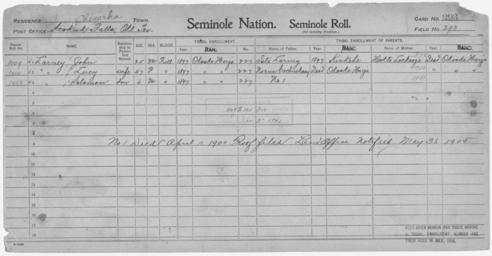 | Keywords: Enrollment for Seminole Census Card 293 - NARA - 267867.jpg Scope and content Name Nocus Cochuckney Type Parent Sex Male City of Residence oh Name Ista Larney Type Parent Sex Male City of Residence k Name John Larney Type By Blood Age 25 Sex Male Degree Indian Blood Full Roll Number 1009 City of Residence oh Name Lucy Larney Type By Blood Age 47 Sex Female Degree Indian Blood Full Roll Number 1010 City of Residence oh Name Solomon Larney Type By Blood Age 6 Sex Male Degree Indian Blood Full Roll Number 1011 City of Residence oh Name Hookte Locksoge Type Parent Sex Female City of Residence oh General notes 267867 Local identifier 75-53A-SEMINOLE 293 Department of the Interior Office of Indian Affairs Office of the Commissioner to the Five Civilized Tribes 1893 - 1914 NARA's Southwest Region Fort Worth NRFA 1400 John Burgess Drive Fort Worth TX 76140 Record group Record Group 75 Records of the Bureau of Indian Affairs 1793 - 1999 Record group ARC 404 Enrollment Cards compiled 1898 - 1914 Series ARC 251747 File unit File unit ARC Variant control numbers NAIL Control Number NRFF-75-53A-28386<br /> NAIL Control Number NRFF-75-53A-39004<br /> NAIL Control Number NRFF-75-53A-39019<br /> NAIL Control Number NRFF-75-53A-39030<br /> NAIL Control Number NRFF-75-53A-39063<br /> NAIL Control Number NRFF-75-53A-39665<br /> NAIL Control Number NRFF-75-53A-SEMINOLE 293 Other versions <gallery> File Enrollment_for_Seminole_Census_Card_293_-_NARA_-_267867 tif tif File Enrollment_for_Seminole_Census_Card_293_-_NARA_-_267867 jpg jpg </gallery> NARA-cooperation PD-USGov Seminole census cards |