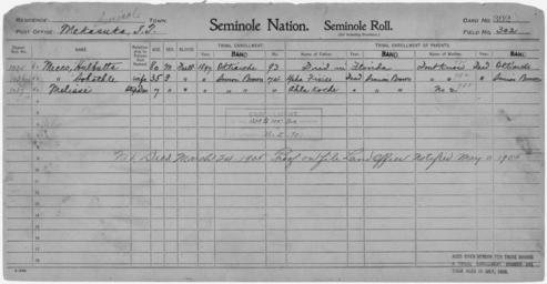 | Keywords: Enrollment for Seminole Census Card 302 - NARA - 267876.jpg Scope and content Name Ahlakoche Type Parent Sex Male City of Residence sb Name Yaha Fixico Type Parent Sex Male City of Residence sb Name Hulbutta Mecco Type By Blood Age 80 Sex Male Degree Indian Blood Full Roll Number 1035 City of Residence o Name Sohathle Mecco Type By Blood Age 35 Sex Female Degree Indian Blood Full Roll Number 1036 City of Residence sb Name Melisse Type By Blood Age 7 Sex Female Degree Indian Blood Full Roll Number 1037 City of Residence sb General notes 267876 Local identifier 75-53A-SEMINOLE 302 Department of the Interior Office of Indian Affairs Office of the Commissioner to the Five Civilized Tribes 1893 - 1914 NARA's Southwest Region Fort Worth NRFA 1400 John Burgess Drive Fort Worth TX 76140 Record group Record Group 75 Records of the Bureau of Indian Affairs 1793 - 1999 Record group ARC 404 Enrollment Cards compiled 1898 - 1914 Series ARC 251747 File unit File unit ARC Variant control numbers NAIL Control Number NRFF-75-53A-22860<br /> NAIL Control Number NRFF-75-53A-32139<br /> NAIL Control Number NRFF-75-53A-41723<br /> NAIL Control Number NRFF-75-53A-41724<br /> NAIL Control Number NRFF-75-53A-41783<br /> NAIL Control Number NRFF-75-53A-SEMINOLE 302 Other versions <gallery> File Enrollment_for_Seminole_Census_Card_302_-_NARA_-_267876 tif tif File Enrollment_for_Seminole_Census_Card_302_-_NARA_-_267876 jpg jpg </gallery> NARA-cooperation PD-USGov Seminole census cards |