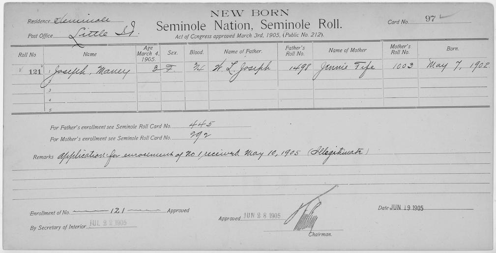 | Keywords: Enrollment for Seminole Census Card 97 - NARA - 267671.tif Scope and content Name Hoktoke Type By Blood Age 14 Sex Female Degree Indian Blood Full Roll Number 341 City of Residence tp Name Itchkanaaha Type Parent Sex Female City of Residence tp Name Jannie Type By Blood Age 55 Sex Female Degree Indian Blood Full Roll Number 339 City of Residence o Name Josey Type By Blood Age 8 Sex Male Degree Indian Blood Full Roll Number 342 City of Residence tp Name Ponnokee Type By Blood Age 45 Sex Male Degree Indian Blood Full Roll Number 338 City of Residence th Name Sefah Type By Blood Age 18 Sex Male Degree Indian Blood Full Roll Number 340 City of Residence tp Name Maney Joseph Type Newborn Age 3 Sex Female Degree Indian Blood 3/4 Roll Number 121 Post Office Little General notes 267671 Local identifier 75-53A-SEMINOLE 97 Department of the Interior Office of Indian Affairs Office of the Commissioner to the Five Civilized Tribes 1893 - 1914 NARA's Southwest Region Fort Worth NRFA 1400 John Burgess Drive Fort Worth TX 76140 Record group Record Group 75 Records of the Bureau of Indian Affairs 1793 - 1999 Record group ARC 404 Enrollment Cards compiled 1898 - 1914 Series ARC 251747 File unit File unit ARC Variant control numbers NAIL Control Number NRFF-75-53A-36520<br /> NAIL Control Number NRFF-75-53A-37219<br /> NAIL Control Number NRFF-75-53A-37472<br /> NAIL Control Number NRFF-75-53A-38180<br /> NAIL Control Number NRFF-75-53A-44358<br /> NAIL Control Number NRFF-75-53A-46434<br /> NAIL Control Number NRFF-75-53A-52663<br /> NAIL Control Number NRFF-75-53A-SEMINOLE 97 yes Other versions <gallery> File Enrollment_for_Seminole_Census_Card_97_-_NARA_-_267671 tif tif File Enrollment_for_Seminole_Census_Card_97_-_NARA_-_267671 jpg jpg </gallery> NARA-cooperation PD-USGov Cherokee census cards NARA TIF images with categorized JPGs |