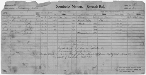 | Keywords: Enrollment for Seminole Census Card 317 - NARA - 267891.jpg Scope and content Name Johnny Alexander Type By Blood Age 1 Sex Male Degree Indian Blood Full City of Residence o Name Johnson Alexander Type By Blood Age 1 Sex Male Degree Indian Blood Full Roll Number 1088 City of Residence o Name Lilly Alexander Type By Blood Age 7 Sex Female Degree Indian Blood Full Roll Number 1086 City of Residence o Name Nancy Alexander Type By Blood Age 5 Sex Female Degree Indian Blood Full Roll Number 1087 City of Residence o Name Rosey Alexander Type By Blood Age 22 Sex Female Degree Indian Blood Full Roll Number 1085 City of Residence o Name Ahalok Choby Type Parent Sex Male City of Residence o Name Tayeche Type By Blood Age 42 Sex Female Degree Indian Blood Full Roll Number 1084 City of Residence o Name Tosekia Type Parent Sex Male City of Residence sb General notes 267891 Local identifier 75-53A-SEMINOLE 317 Department of the Interior Office of Indian Affairs Office of the Commissioner to the Five Civilized Tribes 1893 - 1914 NARA's Southwest Region Fort Worth NRFA 1400 John Burgess Drive Fort Worth TX 76140 Record group Record Group 75 Records of the Bureau of Indian Affairs 1793 - 1999 Record group ARC 404 Enrollment Cards compiled 1898 - 1914 Series ARC 251747 File unit File unit ARC Variant control numbers NAIL Control Number NRFF-75-53A-22962<br /> NAIL Control Number NRFF-75-53A-22963<br /> NAIL Control Number NRFF-75-53A-22966<br /> NAIL Control Number NRFF-75-53A-22995<br /> NAIL Control Number NRFF-75-53A-23004<br /> NAIL Control Number NRFF-75-53A-27945<br /> NAIL Control Number NRFF-75-53A-48641<br /> NAIL Control Number NRFF-75-53A-50051<br /> NAIL Control Number NRFF-75-53A-SEMINOLE 317 Other versions <gallery> File Enrollment_for_Seminole_Census_Card_317_-_NARA_-_267891 tif tif File Enrollment_for_Seminole_Census_Card_317_-_NARA_-_267891 jpg jpg </gallery> NARA-cooperation PD-USGov Seminole census cards |
