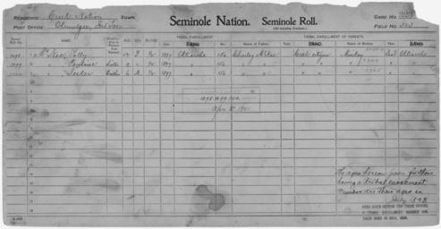 | Keywords: Enrollment for Seminole Census Card 323 - NARA - 267897.jpg Scope and content Name Charley McNac Type Parent Sex Male City of Residence Creek Name Pauline McNac Type By Blood Age 9 Sex Female Degree Indian Blood 1/2 Roll Number 1099 City of Residence o Name Polly McNac Type By Blood Age 12 Sex Female Degree Indian Blood 1/2 Roll Number 1098 City of Residence o Name Seeker McNac Type By Blood Age 6 Sex Male Degree Indian Blood 1/2 Roll Number 1100 City of Residence o Name Minkey Type Parent Sex Female City of Residence o General notes 267897 Local identifier 75-53A-SEMINOLE 323 Department of the Interior Office of Indian Affairs Office of the Commissioner to the Five Civilized Tribes 1893 - 1914 NARA's Southwest Region Fort Worth NRFA 1400 John Burgess Drive Fort Worth TX 76140 Record group Record Group 75 Records of the Bureau of Indian Affairs 1793 - 1999 Record group ARC 404 Enrollment Cards compiled 1898 - 1914 Series ARC 251747 File unit File unit ARC Variant control numbers NAIL Control Number NRFF-75-53A-41582<br /> NAIL Control Number NRFF-75-53A-41619<br /> NAIL Control Number NRFF-75-53A-41624<br /> NAIL Control Number NRFF-75-53A-41629<br /> NAIL Control Number NRFF-75-53A-42230<br /> NAIL Control Number NRFF-75-53A-SEMINOLE 323 Other versions <gallery> File Enrollment_for_Seminole_Census_Card_323_-_NARA_-_267897 tif tif File Enrollment_for_Seminole_Census_Card_323_-_NARA_-_267897 jpg jpg </gallery> NARA-cooperation PD-USGov Seminole census cards |