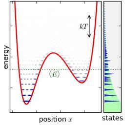 | Keywords: Ensemble quantum 1DOF canonical.png en Ensemble canonically distributed over energy for a quantum system consisting of one particle in a potential well 2013-10-30 22 45 43 own Nanite Source Created with Matplotlib Python source code Requires matplotlib <source lang python > from pylab import figformat ' png' saveopts 'dpi' 300 'bbox_inches' 'tight' 'transparent' True 'frameon' True seterr divide 'ignore' Very important number smaller means more classical finer-spaced discrete levels larger means more quantum fewer discrete levels hbar 0 7/ 2 pi temp_canonical 4 1 energy_microcanonical -2 0 range_microcanonical 1 0 micro_e0 energy_microcanonical - 0 5 range_microcanonical micro_e1 energy_microcanonical + 0 5 range_microcanonical def potential x return x 6 + 4 x 3 - 5 x 2 - 4 x x linspace -2 5 2 5 1001 dx x1 - x0 U potential x mass 1 0 compute pixel edges used for pcolormesh xcorners zeros len x +1 xcorners len x x-0 5 dx xcorners-1 x-1 + 0 5 dx make an energy range for plots vs energy E linspace -20 20 10001 define color map that is transparent for low values and dark blue for high values weighted to show low probabilities well cdic 'red' 0 0 0 1 0 0 'green' 0 0 0 1 0 0 'blue' 0 0 7 0 7 1 0 7 0 7 'alpha' 0 0 0 0 1 0 4 0 4 0 2 0 6 0 6 0 4 0 8 0 8 0 6 0 9 0 9 1 1 1 cm_prob matplotlib colors LinearSegmentedColormap 'prob' cdic To get eigenvalues we need to set up a NxN matrix for the Schrodinger equation Hamiltonian For the momentum operator -hbar 2/ 2 m d 2/dx 2 the typical central difference approximation will be used H zeros len x len x set diagonal H ravel 0 len x +1 hbar hbar/ mass dx dx H ravel 0 len x +1 + U set above and below diagonal H ravel 1 len x +1 -0 5 hbar hbar/ mass dx dx H ravel len x len x +1 -0 5 hbar hbar/ mass dx dx Right the hamiltonian is set up so let's just go ahead and diagonalize it poink eigval eigvec eigh H def doev H Emax lowE_idx find eigval<Emax figure for i in lowE_idx plot x eigvec i label 'E '+str eigvali legend fontsize 8 micro eigval > micro_e0 eigval < micro_e1 1 0 print microcanonical E0 energy_microcanonical Delta 0 5 range_microcanonical avg energy print sum eigval micro /sum micro canonical exp -eigval/temp_canonical canonical_avgE sum eigval canonical /sum canonical print canonical T temp_canonical avg energy print canonical_avgE Boring level plot fig figure ax axes plot x potential x linewidth 3 for i in find eigval< 13 axhline eigvali color 0 5 0 5 0 5 linewidth 0 5 zorder -1 ylim -8 9 xlim -2 1 1 7 fig get_axes 0 xaxis set_ticks -2 -1 0 1 xlabel position x ylabel potential U x fig set_size_inches 3 3 fig patch set_alpha 0 savefig quant_potential_eigval_lines +figformat saveopts def levelplot weights Plot the potential with eigenstates' wavefunctions superimposed shown weights list fractions to multiply each eigenstate probability e g weight 0 do not show weight 1 fully show name filename to save to fig figure ax axes 0 08 0 1 0 73 0 89 0 125 0 1 0 71 0 8 plot x potential x linewidth 2 color 'r' zorder -1 maxp dx 3 5 amax weights eigwidth 0 2 for i in find eigval< 9 Here we plot the eigenfunctions as horizontal bars of varying darkness with height set by the energy eigenvalue if weightsi 0 continue don't plot levels with zero weight pdist eigvec i 2 weightsi pdist shape 1 len x extent amin x -0 5 dx amax x +0 5 dx eigvali-0 5 eigwidth eigvali+0 5 eigwidth img imshow vstack pdist pdist cmap cm_prob extent extent interpolation 'none' aspect 'auto' Alternate code using pcolormesh doesn't work because of ugly edges ycorners vstack eigvali-0 5 eigwidth len x +1 eigvali+0 5 eigwidth len x +1 pcolormesh vstack xcorners xcorners ycorners pdist cmap cm_prob clim 0 maxp ylim -9 9 xlim -2 1 1 7 fig get_axes 0 xaxis set_ticks -2 -1 0 1 ax xaxis set_ticklabels ax yaxis set_ticklabels ax xaxis labelpad 2 ax yaxis labelpad -3 xlabel position x ylabel energy ax axes 0 83 0 1 0 14 0 89 axisbg 0 95 0 95 0 95 ax xaxis set_ticks ax yaxis set_ticklabels ax yaxis set_ticks_position 'right' ylim -9 9 xlabel states dos E 0 0 for i Elevel in enumerate eigval Here we sum up the density of states function if Elevel > 20 continue don't waste time with high levels dos + exp -4 E-Elevel /eigwidth 2 weightsi fill_betweenx E dos linewidth 0 color 0 2 0 2 0 76 xlim -0 05 max dos max dos 1 1 fig set_size_inches 3 3 fig patch set_alpha 0 levelplot ones len eigval savefig quant_potential_eigval_pdists +figformat saveopts levelplot micro sca gcf axes0 axhspan micro_e0 micro_e1 color 0 7 1 0 7 zorder -2 sca gcf axes1 axhspan micro_e0 micro_e1 color 0 7 1 0 7 zorder -2 savefig quant_potential_eigval_pdists_micro +figformat saveopts levelplot canonical sca gcf axes0 annotate \\langle E\\rangle -0 5 canonical_avgE textcoords None verticalalignment 'top' color 0 0 4 0 axhline canonical_avgE linestyle 'dotted' linewidth 1 color 0 0 4 0 annotate 1 2 7 -temp_canonical 1 2 7 arrowprops 'arrowstyle' '<->' text 1 15 7 -0 5 temp_canonical ' kT ' horizontalalignment 'right' verticalalignment 'center' sca gcf axes1 axhline canonical_avgE linestyle 'dotted' linewidth 1 color 0 0 4 0 fill_betweenx E exp -E/temp_canonical linewidth 0 color 0 7 1 0 7 zorder -2 green exponential savefig quant_potential_eigval_pdists_canonical +figformat saveopts Position expectation values figure pdist zeros len x for i p in enumerate micro pdist + p eigvec i 2 if any micro plot x pdist/sum micro /dx label 'microcanonical' pdist zeros len x for i p in enumerate canonical pdist + p eigvec i 2 plot x pdist/sum canonical /dx label 'canonical' color 'g' xlim -2 1 1 7 fig get_axes 0 xaxis set_ticks -2 -1 0 1 xlabel position x ylabel PDF of position P x legend savefig quant_position_pdf +figformat saveopts </source> cc-zero Images with Python source code Uploaded with UploadWizard 1D potential wells Statistical ensemble |