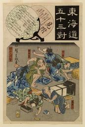 | Keywords: Enshuya Matabei - Tokaido gojusan tsui - Walters 95571.jpg In this print everything goes topsy-turvy as people run into each other trying to escape from a snapping turtle This print illustrates a scene from the comic novel Footing It along the Tokaido Road or Shank's Mare by Jippensha Ikku 1765-1831 The main characters are Yaji and Kita two happy-go-lucky travelers who experience many adventures as they go along the road between Edo Tokyo and Kyoto The 53 stations of the Tokaido in pairs ca 1845 1846 late Edo pigments mulberry paper cm 36 83 24 45 accession number 95 571 36836 Justine Lewis Keidel date and mode of acquisition unknown Walters Art Museum Gift of Justine Lewis Keidel 1991 Signature Hiroshige giga; Transcription Hizakurige kokkei; Translation Hizakurige Humor place of origin Japan http //www kunisada de/Kunisada-Tokaido-Series/parallels/Tokaido-parallels1 20 htm p29 Kunisada Project Series Tōkaidō gojūsan tsui Walters Art Museum license 2D Japanese prints in the Walters Art Museum Historic samurai prints Media contributed by the Walters Art Museum needs category review The 53 stations of the Tokaido in pairs |