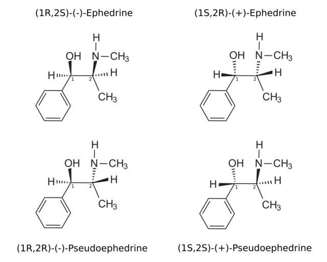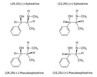 | Keywords: Ephedrine pseudoephedrine isomers.svg en The four diastereoisomers of ephedrine Top ephedrine<br> Bottom pseudoephedrine<br> IUPAC Name 2- methylamino -1-phenylpropan-1-ol The stereocenters are numbered own Wickey-nl 2009-12-15 Inkscape validSVG Ephedrine Pseudoephedrine |