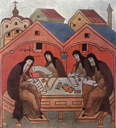 | Keywords: Epiphanius the Wise.jpg en Epiphanius the Wise ru Писцы книг иниатю а из лицевого «Жития п еподобного Се гия Радонежского» XVI в из соб ания Т оице-Се гиевой Лав ы лист 4-й Разме 12 6 × 11 5 см В настоящее в емя «Житие» х анится в Отделе укописей РГБ Епифаний П емуд ый изоб ажен слева он уже наче тал пе вые слова «Жития» Д угие монахи должны писать под его диктовку // Источник Составитель Пелевин Ю А ; изоб Владими ов Гео гиевский Г П Д евне усская миниатю а 100 листов миниатю с описанием и статьями Academia 1933 http //historydoc edu ru/catalog asp cat_ob_no ob_no 13252 Российский об азовательный по тал author XVI в PD-Art ImageNote 1 29 250 169 308 531 590 2 Epiphanius the Wise ImageNoteEnd 1 Illuminated manuscripts created in Russia |