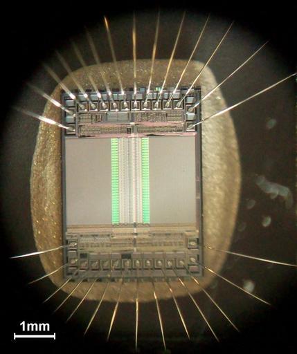 Keywords: Epromf.jpg en Chip of a 256k EPROM with aluminum bond wires The grey area contains the storage cells wich are too small to be seen de Chip eines 256k EPROM mit Aluminium-Bonddrähten Der Bereich der Speicherzellen erscheint grau da die Vergrößerung nicht ausreicht own Ulfbastel PD EPROM Wire bonding |