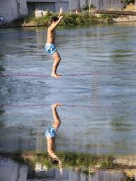Keywords: equlibrista naviglio acrobat guy jump walk line lake sport