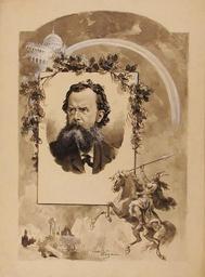 | Keywords: Erdmann Wagner Felix Dahn.jpg Porträt des Dichters Felix Dahn vor Architekturkulisse und berittener Kriegerin Lavierte Tuschfederzeichnung in Sepiatönen weiss gehöht Bl 45 5 x 33 cm http //www zeller de Auktionshaus Zeller by 1917 Erdmann Wagner 1842-1917 PD-old-70-1923 Images from Auktionshaus Zeller Erdmann Wagner Felix Dahn |