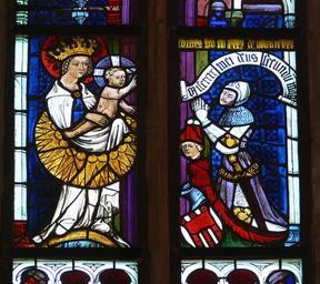 | Keywords: Eriskirch Pfarrkirche Stifterfenster 3.jpg Glasfenster im Chor der Kath Pfarrkirche Unserer Lieben Frau Eriskirch<br /> Linkes Chorfenster Chorfenster nord II ˛Stifterfenster 3 Zeile von unten Maria im Strahlenkranz mit Graf Heinrich IV von Montfort-Tettnang 1408 um 1410 “1430 Inschrift comes hainric us de montfort auf dem Spruchband Miserere mei deus secundu m mag nam misericordiam Psalm 50 3 own own photograph 2010-02 Photo Andreas Praefcke Own work all rights released Public domain Stained glass windows in Pfarrkirche Eriskirch Montfort family Swabia Stained glass windows of Madonna and child in Germany People praying on stained glass windows Coats of arms of Montfort Photos by User AndreasPraefcke 15th-century stained glass windows in Germany |