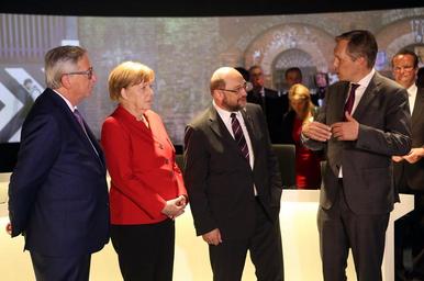 | Keywords: berlin germany BERLIN, GERMANY - MAY 12: (L to R) European Commission President Jean-Claude Juncker, German Chancellor Angela Merkel, Martin Schulz, president of the European Union Parliament, and Frank Piplat, head of the information office of the European Parliament in Germany, participate in the re-opening of the European House and in the inauguration of "Europa Experience The Exhibition" in the European House Berlin. (Photo by Adam Berry/EU/AFP-Service) BERLIN, GERMANY - MAY 12: (L to R) European Commission President Jean-Claude Juncker, German Chancellor Angela Merkel, Martin Schulz, president of the European Union Parliament, and Frank Piplat, head of the information office of the European Parliament in Germany, participate in the re-opening of the European House and in the inauguration of "Europa Experience The Exhibition" in the European House Berlin. (Photo by Adam Berry/EU/AFP-Service) |